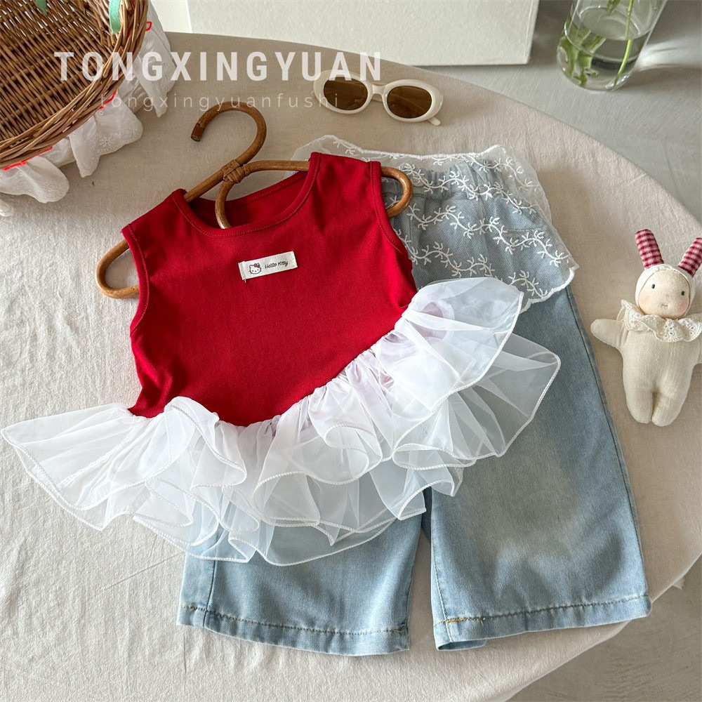 子供スターラウンドガールズスタイルスーツトップベストジーンズ新しい女の子ノースリーブ夏スプライシングツーピーストレンディセット