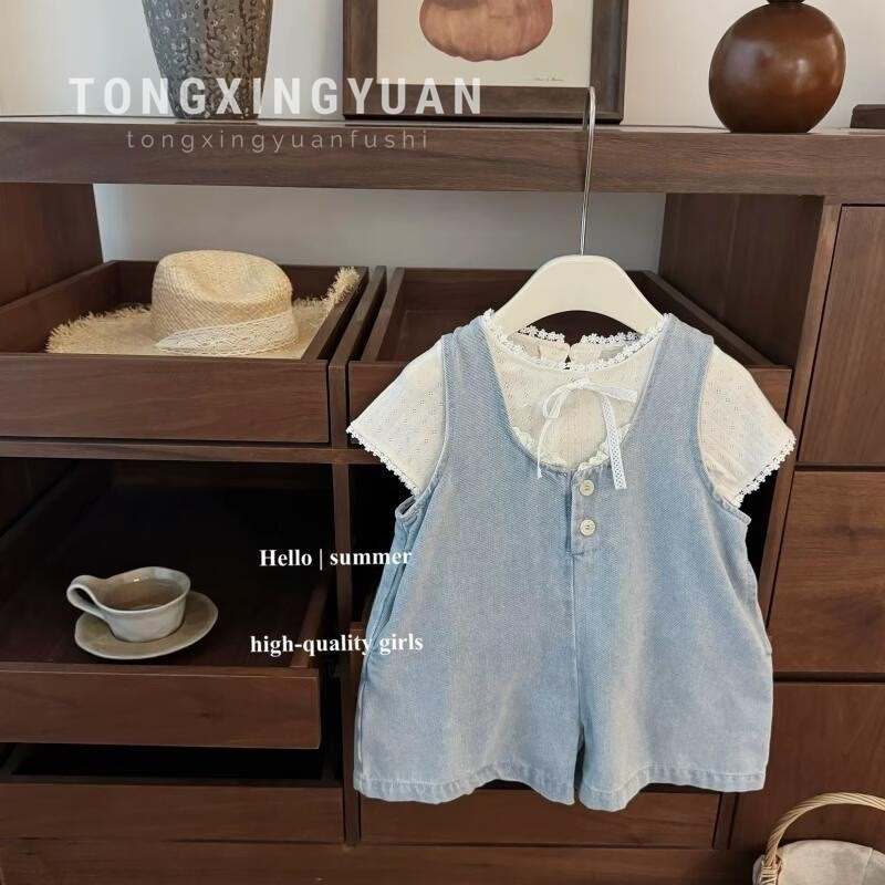 【童星円】ins小ブロガー ~ 女宝甘酷カウボーイ連体バックパンツ蝶結び半袖2点セット