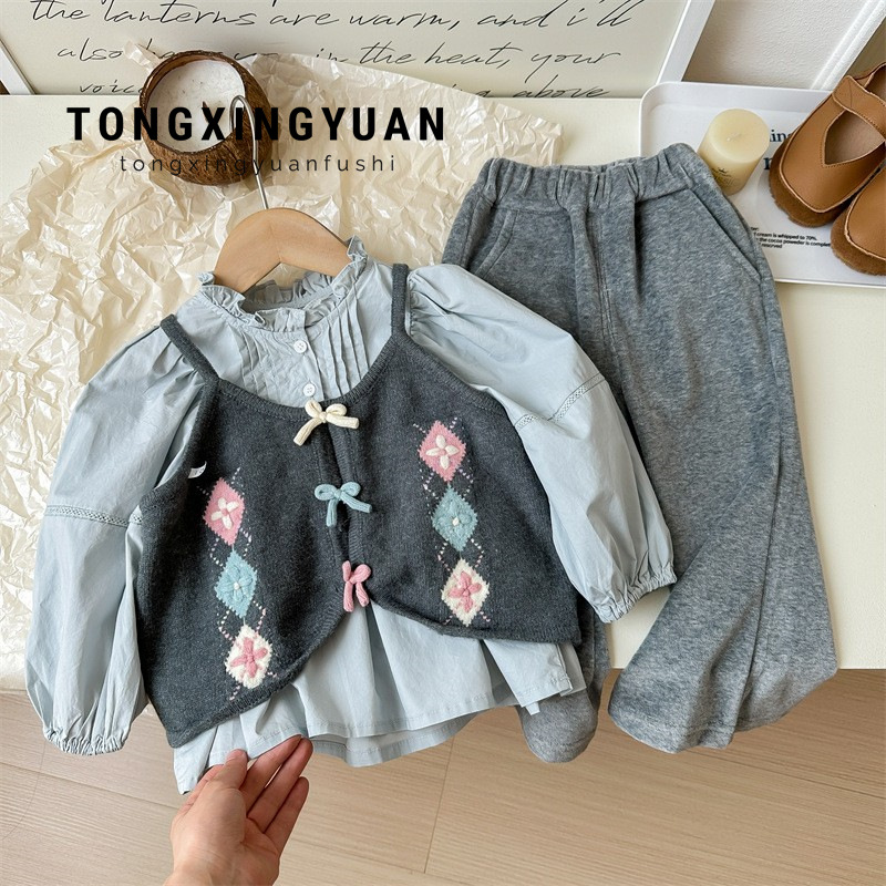 子供星円韓系子供服女の子春秋セット2024新型子供蝶結びチョッキシャツトランペット