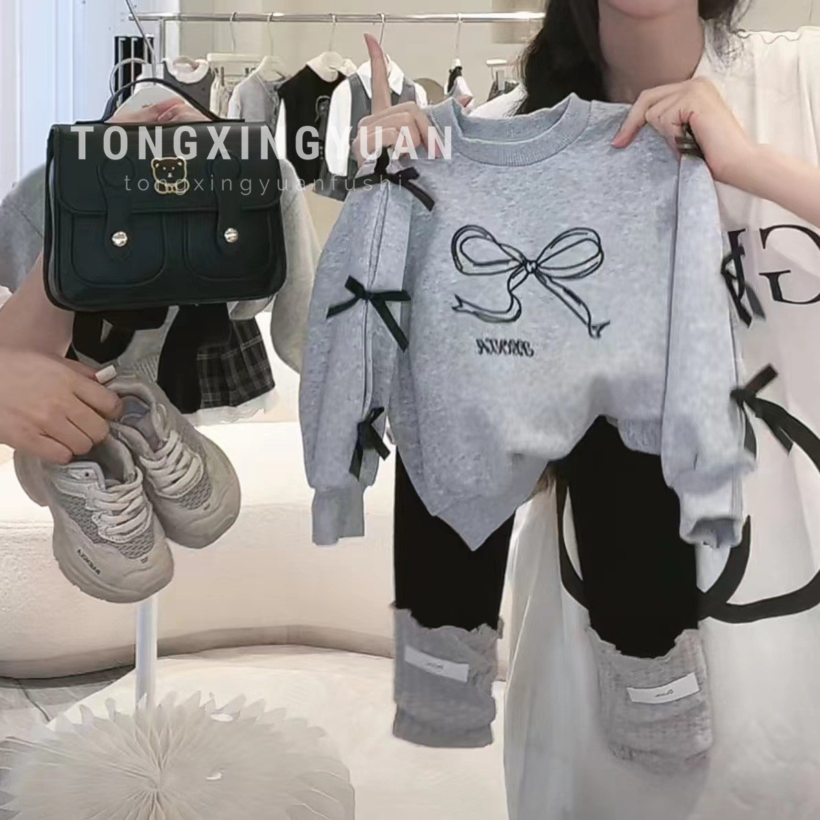 子供の星の丸いかわいい蝶結びのパーカーの秋の女の子の丸首の上着の大衆のデザイン感はレギンスのスーツをつなぎ合わせます。