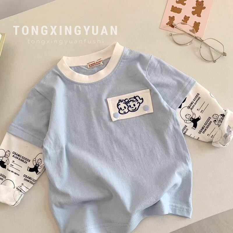 Tongxingyuan 子供服長袖 Tシャツ 2025 春と秋の男の子と女の子のボトムスシャツ偽ツーピースソフトトップス卸売 T