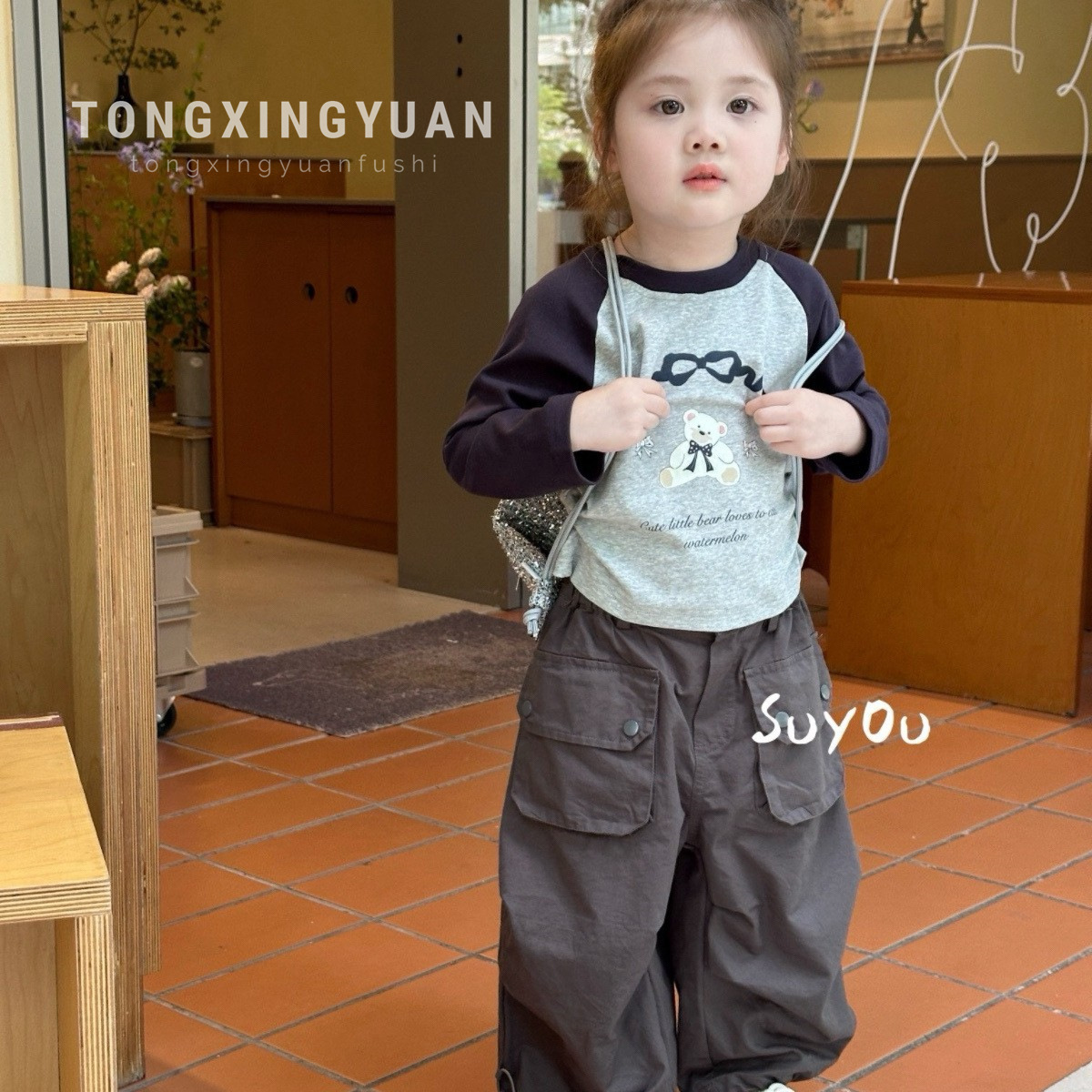 童星円秋の新型洋気韓国版女の子漫画熊長袖tシャツ綿布工装ズボンセット春秋