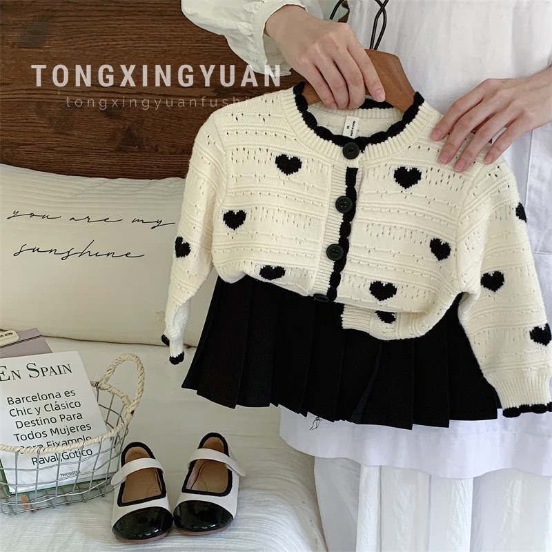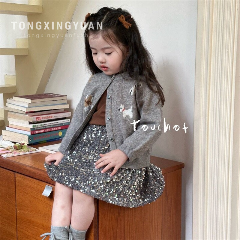 童星園韓国子供服2025秋新作韓国風女児ニットカーディガンインナーシャツスパンコールスカートセット