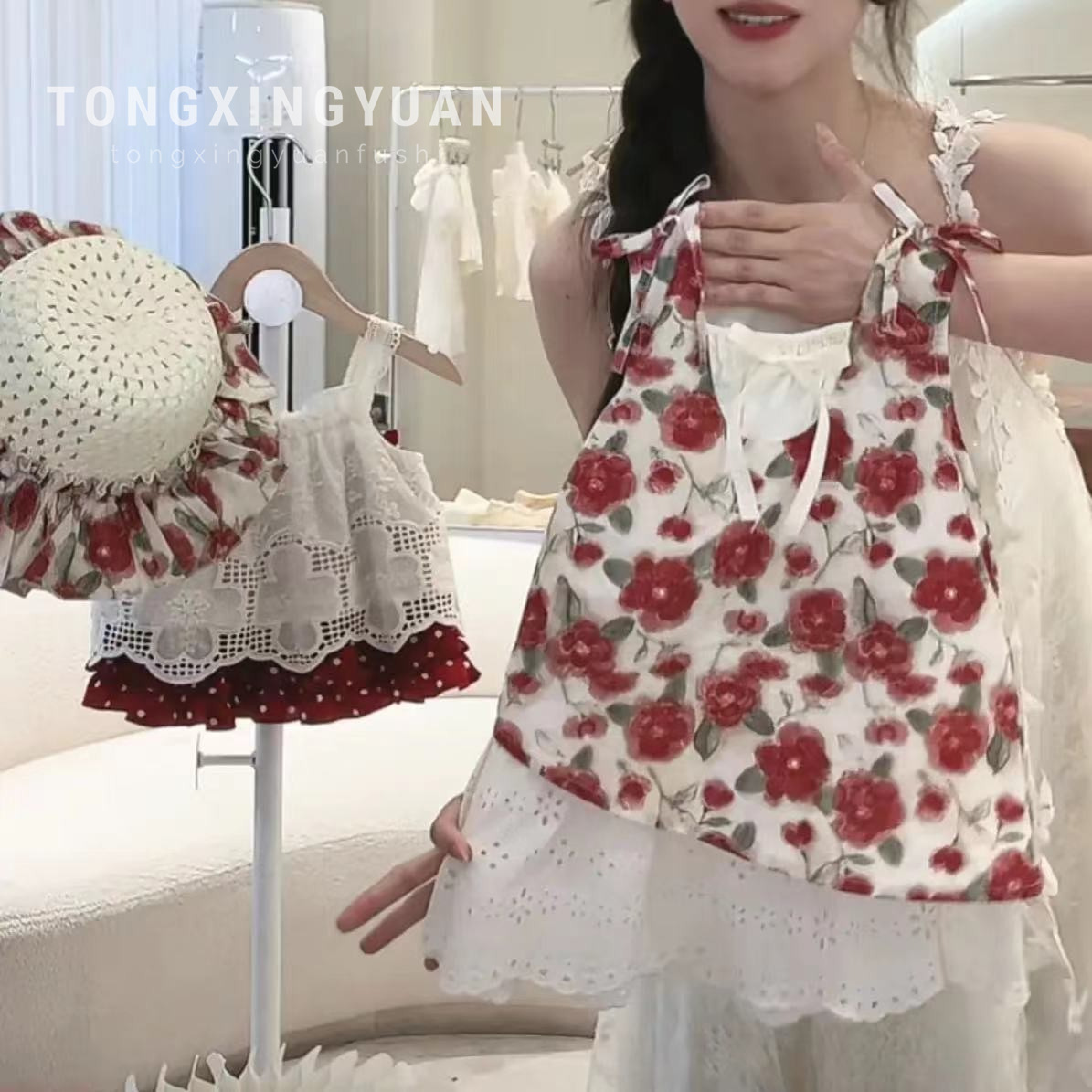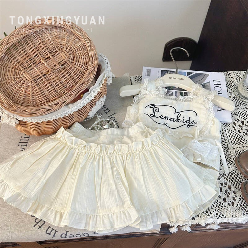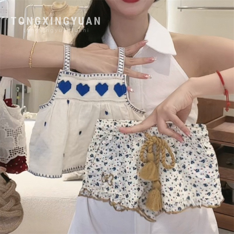 童星円韓系女の子刺繍キャミソール夏新作女の子純色チョッキ洋気砕花半ズボンセット