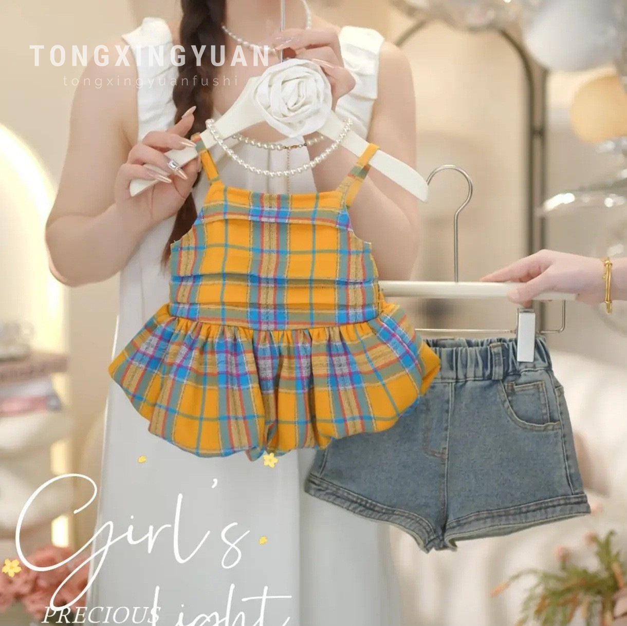 子供の星円の女の子の夏の格子のつぼみのガーターのスーツの新型の子供の洋気の流行の半ズボンの2つのセットの薄いタイプ