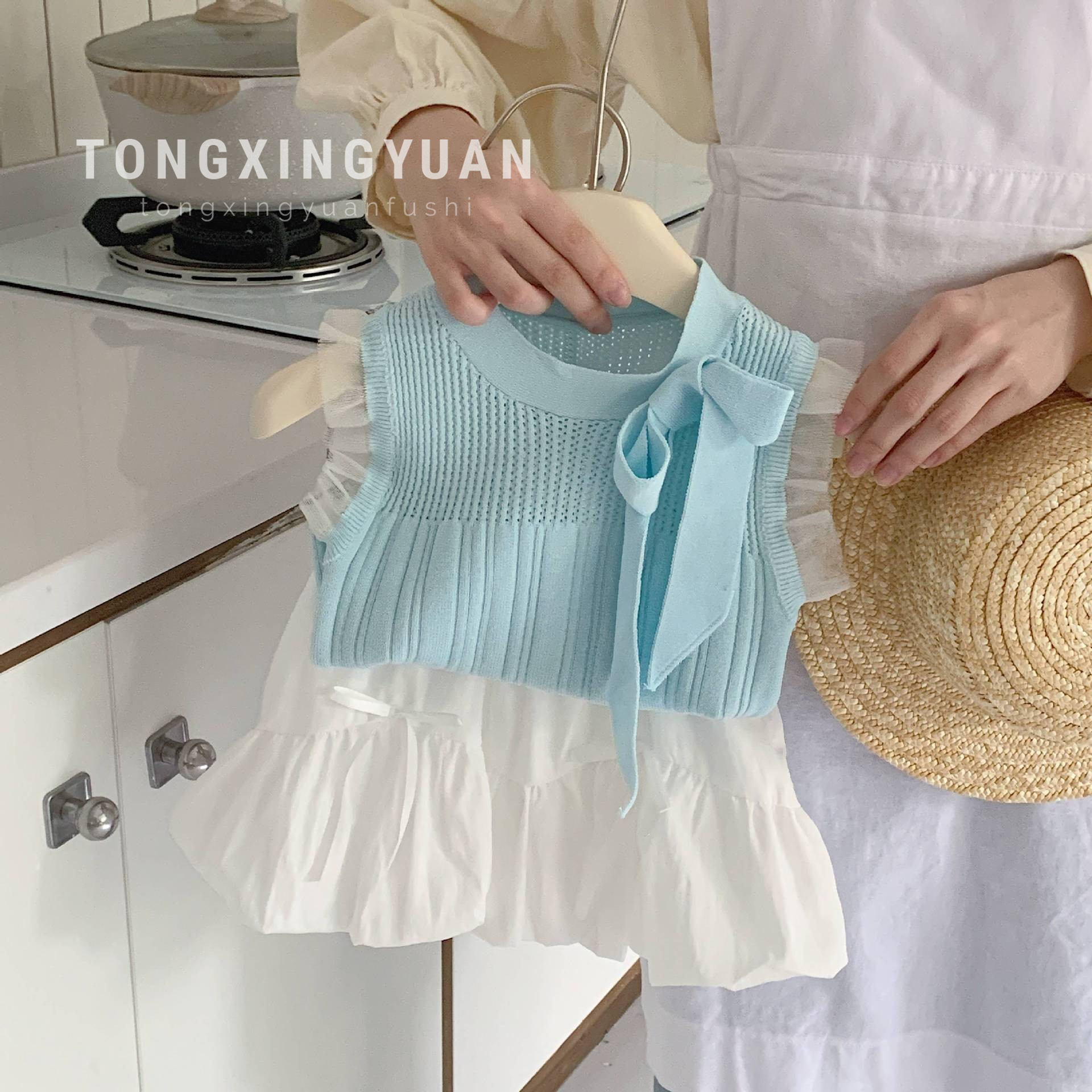 子供の星の丸い女の子の夏の新型の洋風の子供の服の蝶結びのニットのベストの上着のつぼみのスカートのスーツの韓国版