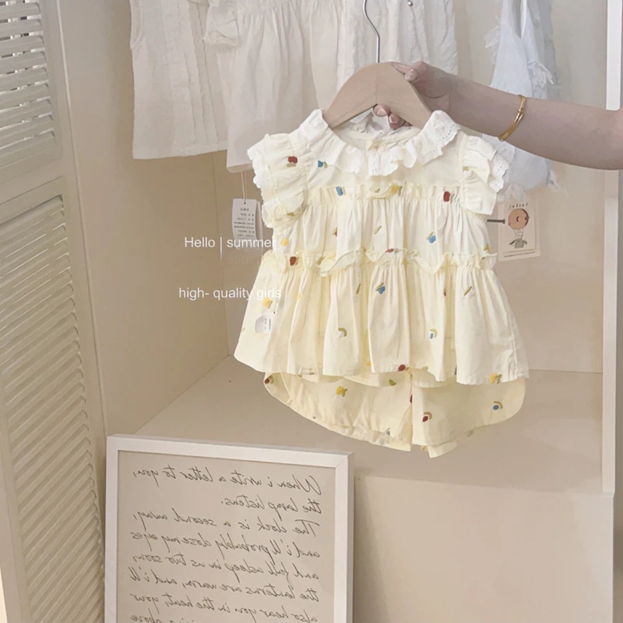 子供星円韓国版子供服2025新型夏の女の子の飛袖子供服子供の洋風の薄いタイプの2つのセットのファッション