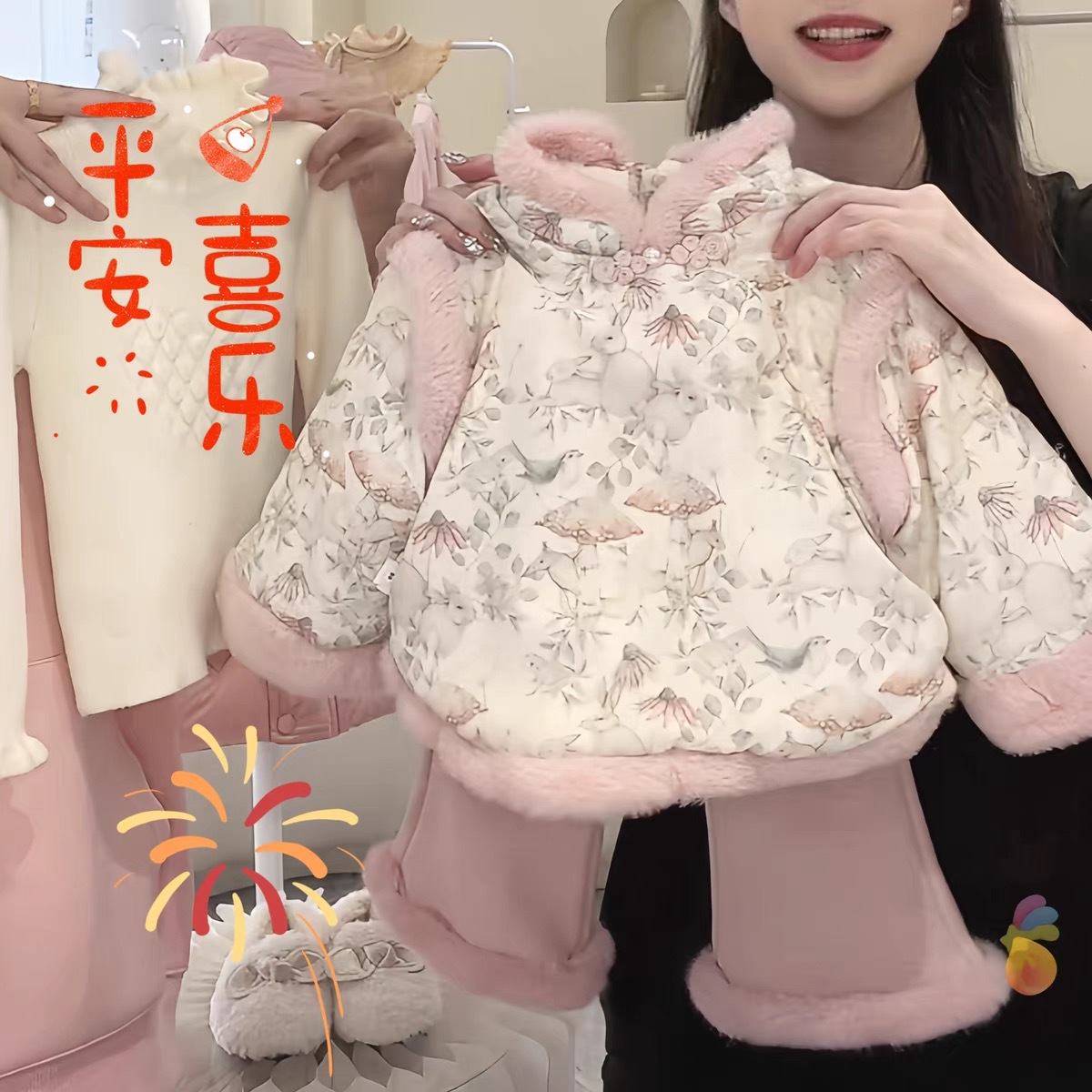 童星円女の子スーツ冬服洋気子供服ベルベット満1歳ドレス新年拝年漢服2点セット