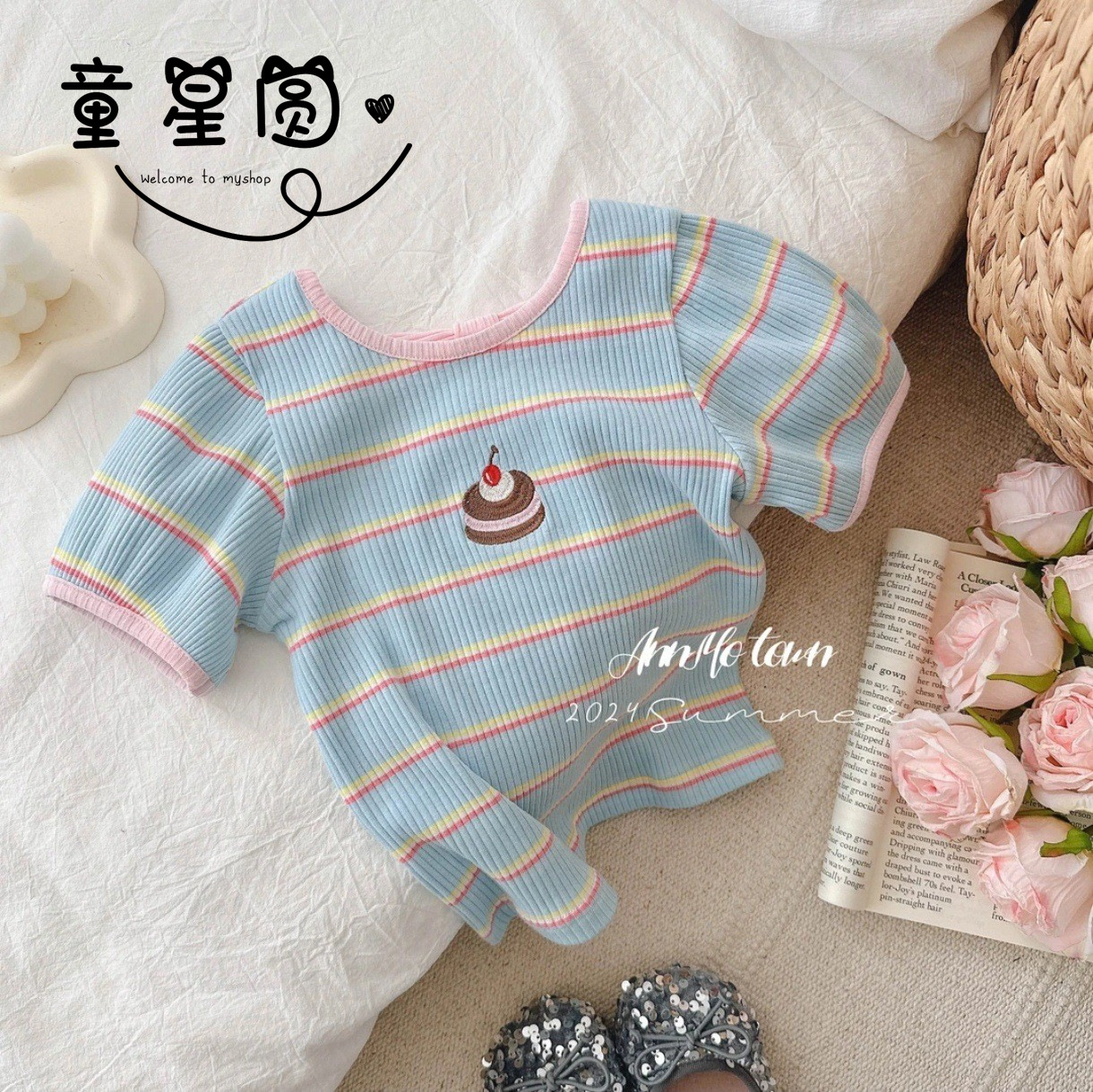 子供星円韓国版子供服女の子半袖tシャツ夏子供用ニットブルーストライプケーキ上着ボトムt
