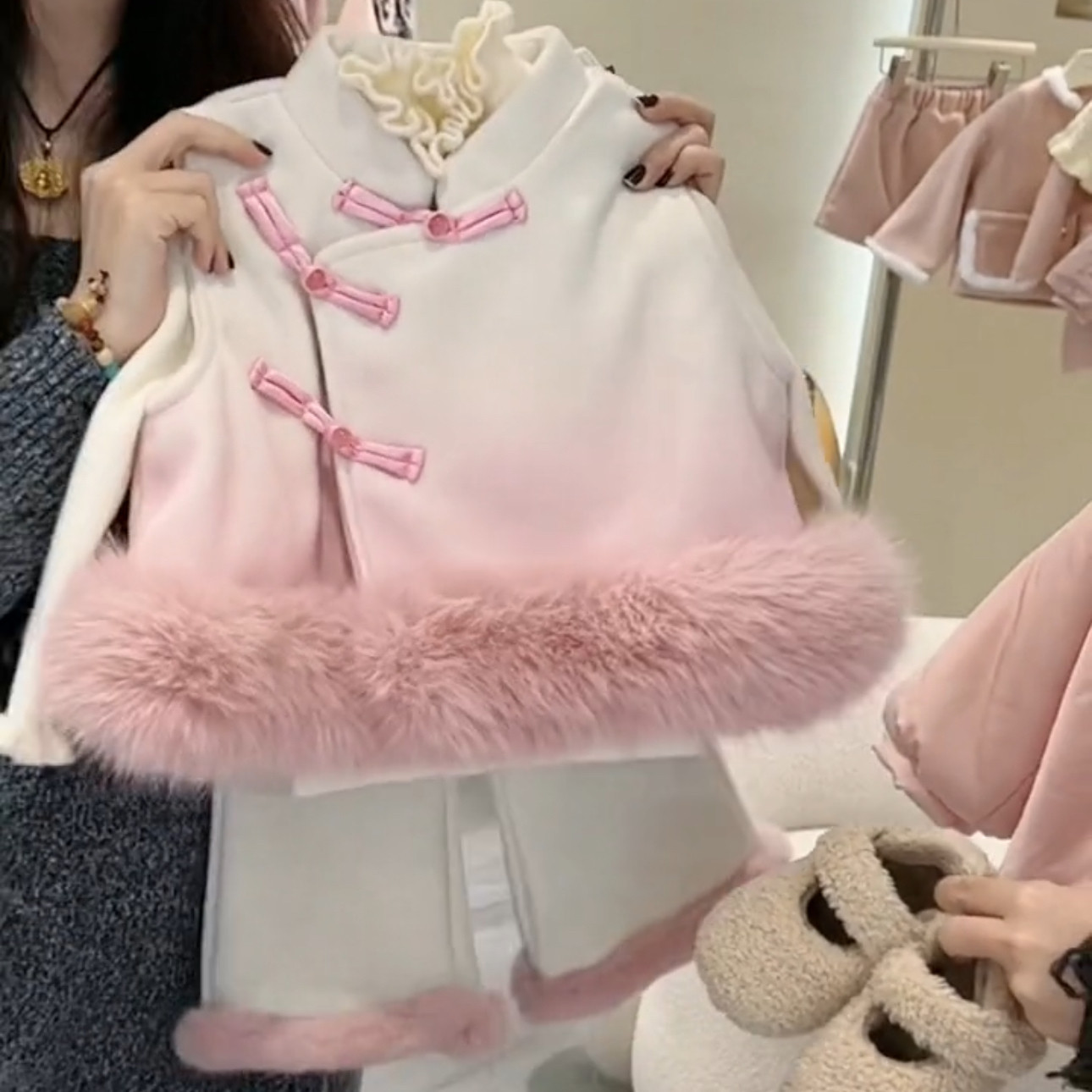 現物秒発拝年服女の子グラデーション色チャイナドレス馬甲秋冬新作女の子毛ベストセット