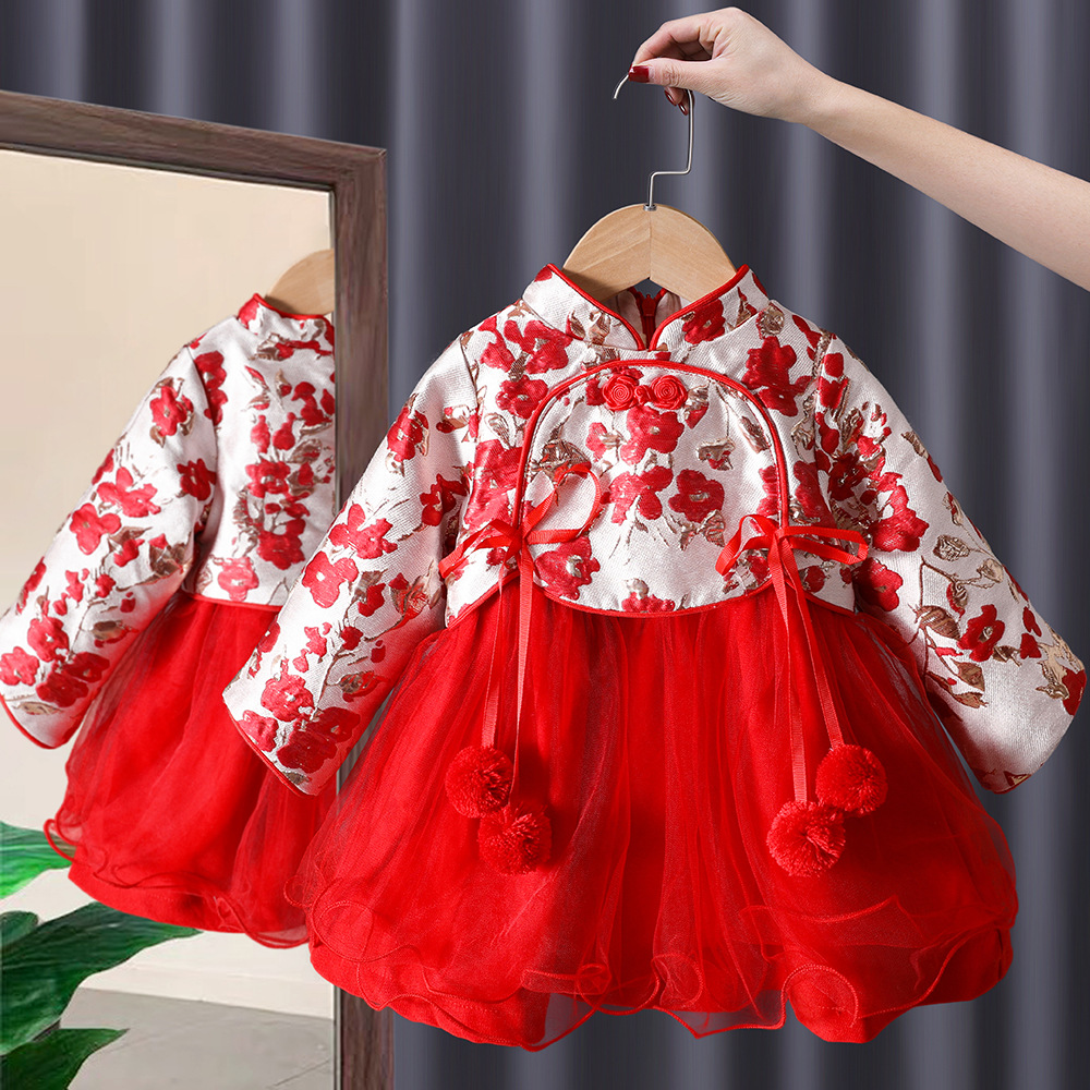 漢服のワンピースの子供は秋冬服のスカートの女性の赤ちゃんの満1歳のドレスの王女のスカートのファッションを祝います。