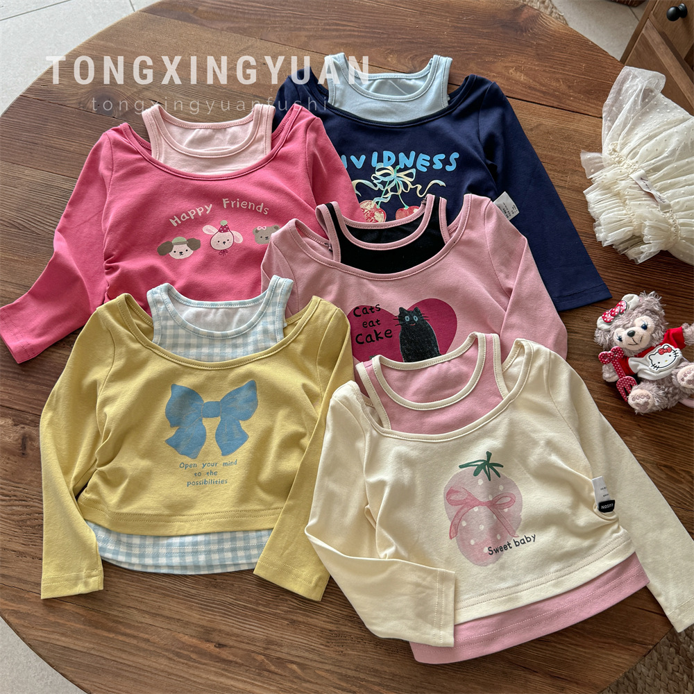 子供スターラウンド韓国女の子春と秋の新しい偽ツーピース Tシャツ新しい漫画プリントかわいいトップ秋のトレンディな t