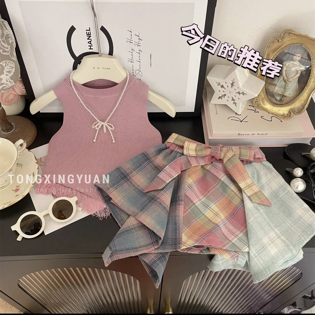 子供の星の丸い女の子のスーツの夏の新型の女の子の赤ちゃんの韓国版のフリンジベストのデザイン感の格子のスカートのズボンの2つのセット