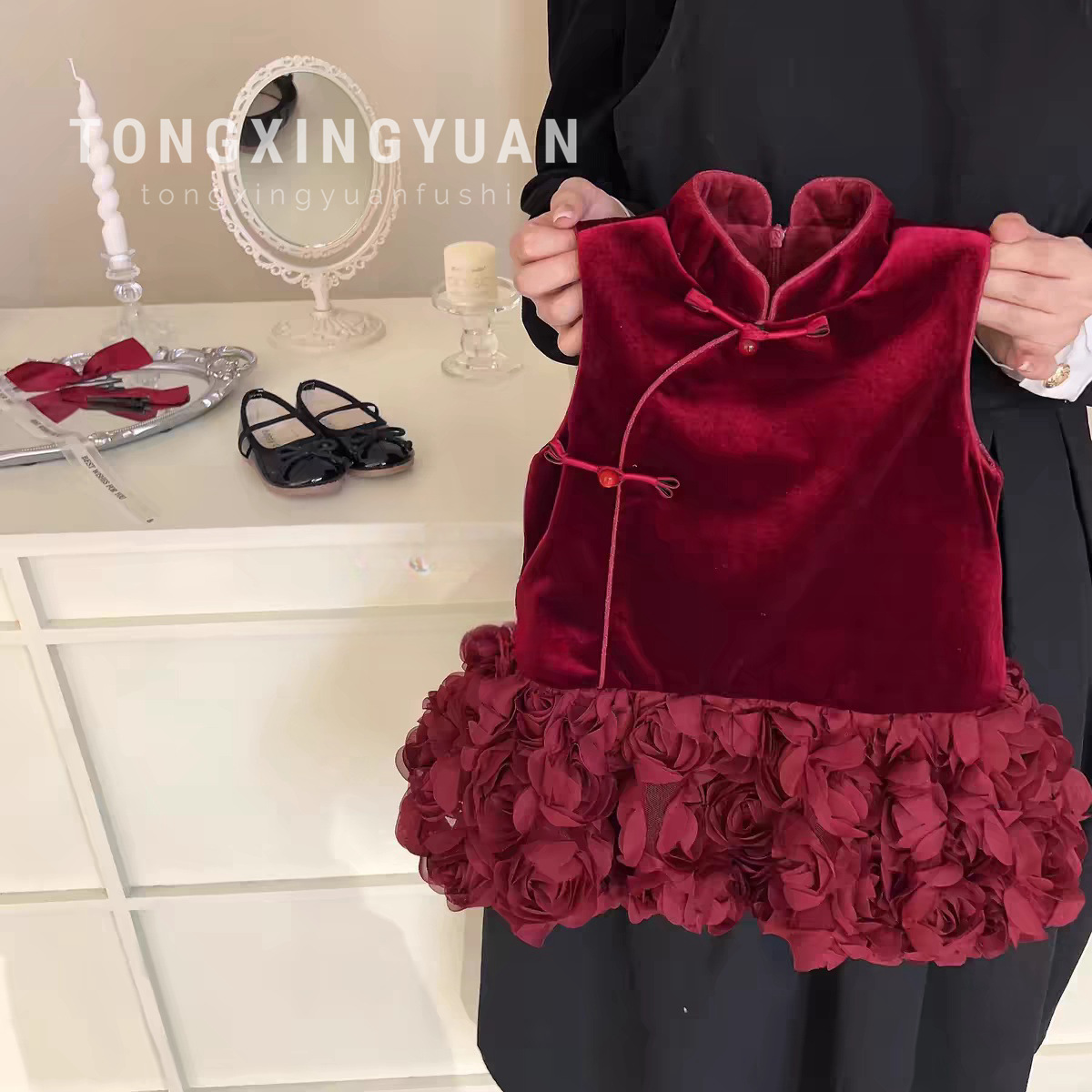 子供の星の丸い女の子のベルベットの冬の新年のドレスの赤い国風のチャイナドレスのワンピースのベストのスカートの女性の赤ちゃんのスカート