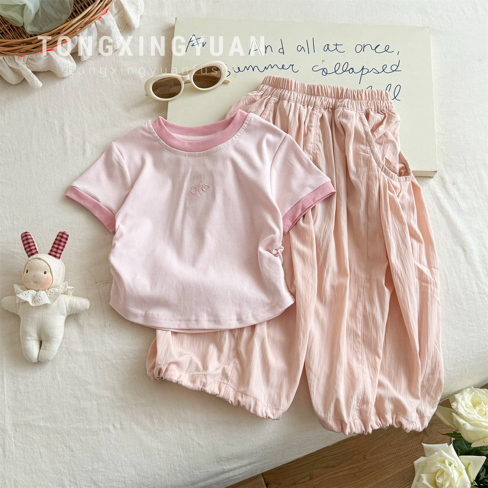 子供スターラウンド子供服女の子サマースーツ子供半袖速乾オーバーオールパンツ夏の新しい子供のツーピースセット