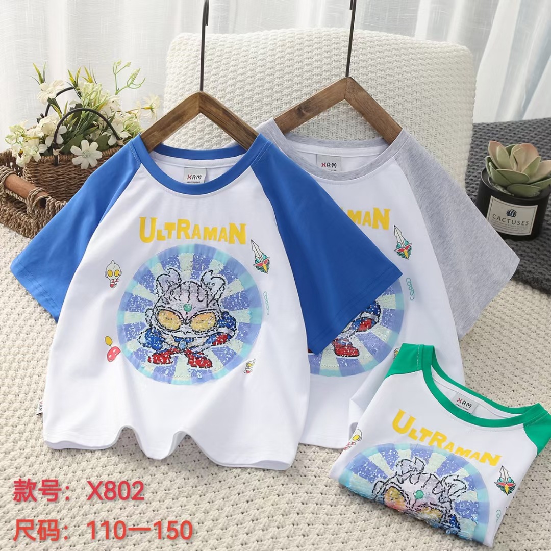 夏の新型男児半袖tシャツ男の子漫画変顔スパンコール氷磁器綿半袖丸襟シャツ男宝rb802