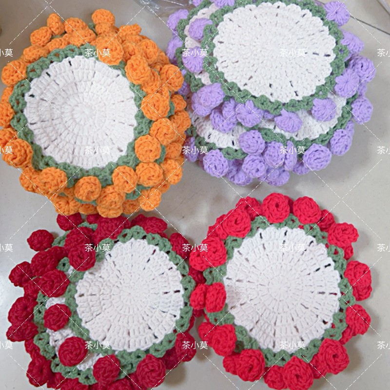 完成した手作りのバラの花束コースター、毛糸のかぎ針編みカップ、手持ちの花束、クリエイティブなギフト、編まれた花のコースター