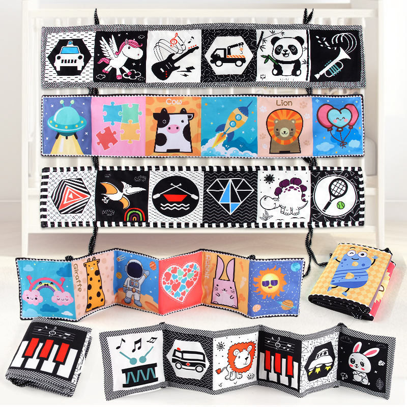 赤ちゃんの布の本の両面のカラーの白黒の布の本のベッドの周りのペンダントのおもちゃの認知の形の動物は引き裂かれません。