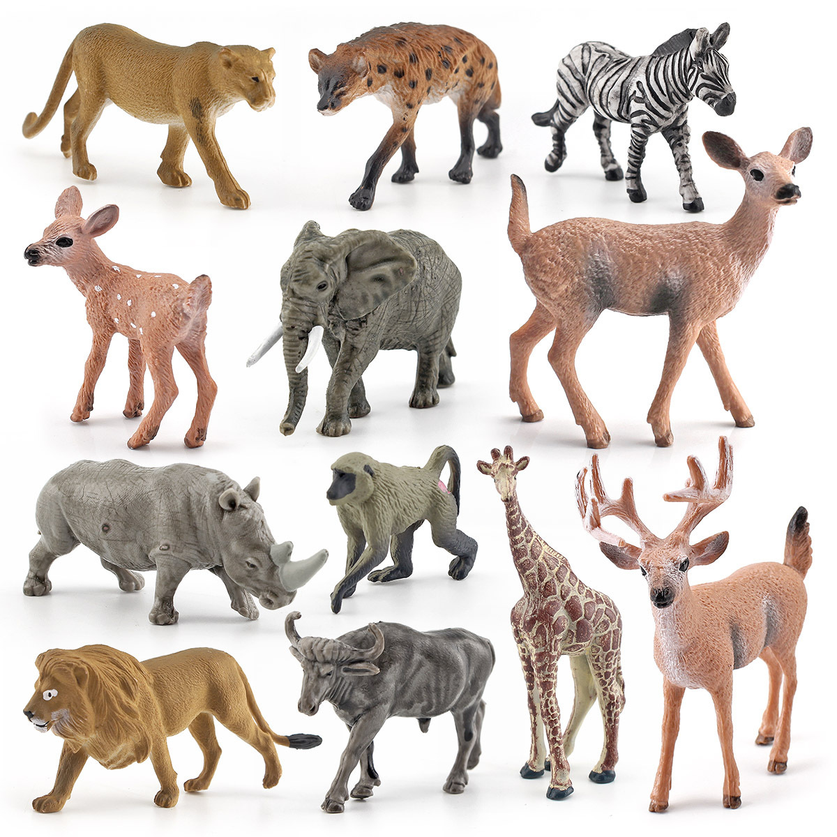 シミュレーション12pcs森林動物キリンサイライオンシマウマ象水牛ヒヒ白尾鹿模型置物