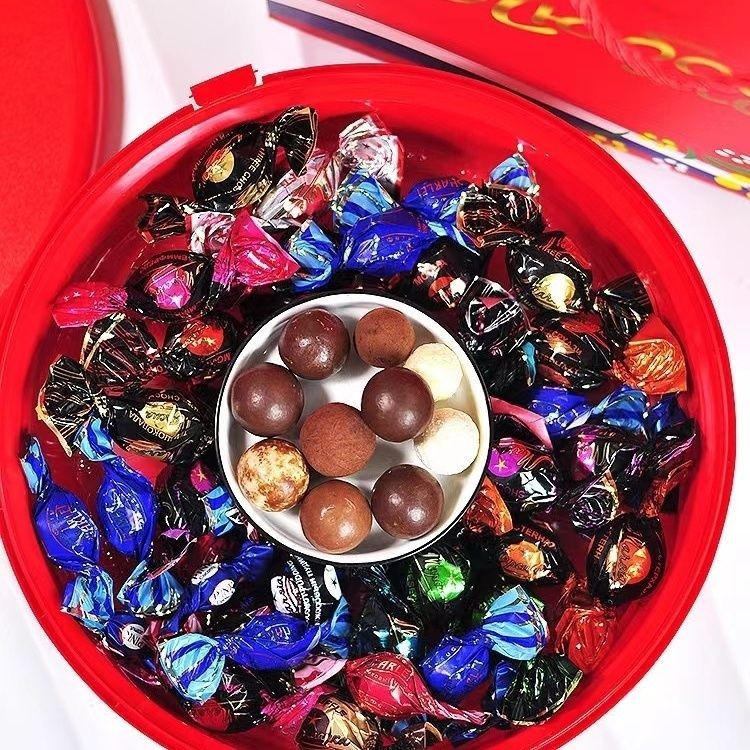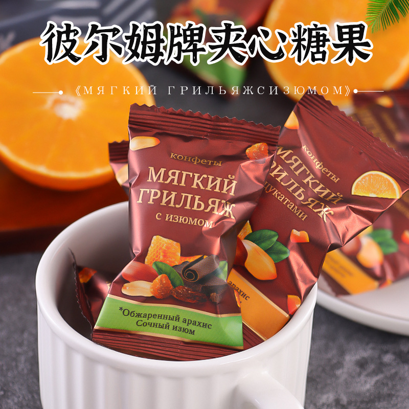 ロシアから輸入されたチョコレートキャンディーのペルムブランドのピーナッツのレーズンは、カジュアルなお菓子の新年の砂糖を挟んでいます。
