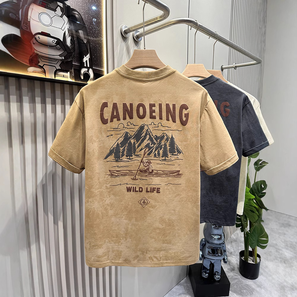 高級レトロ雲染め半袖Tシャツメンズ2025春新作ヘビーウェイトTシャツルーズ半袖プリントトップ