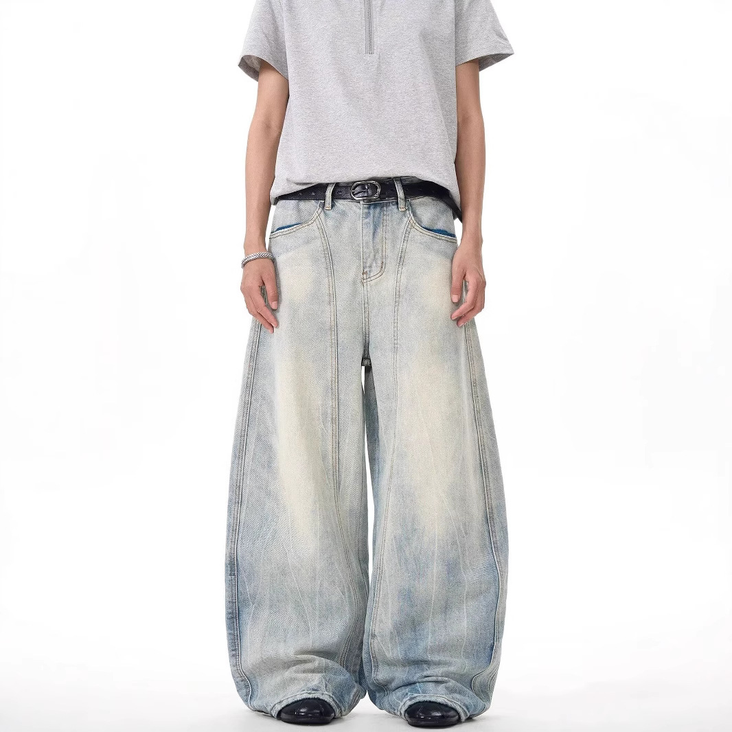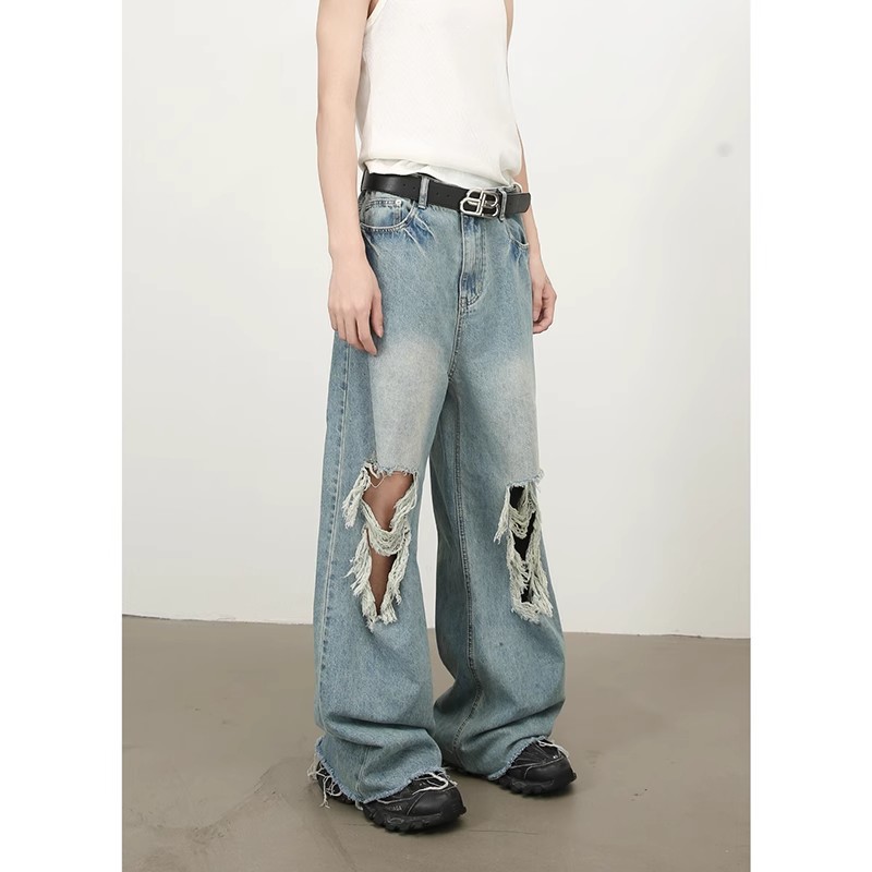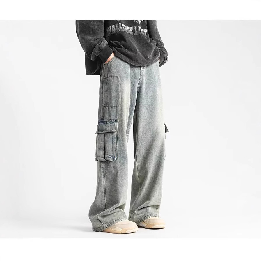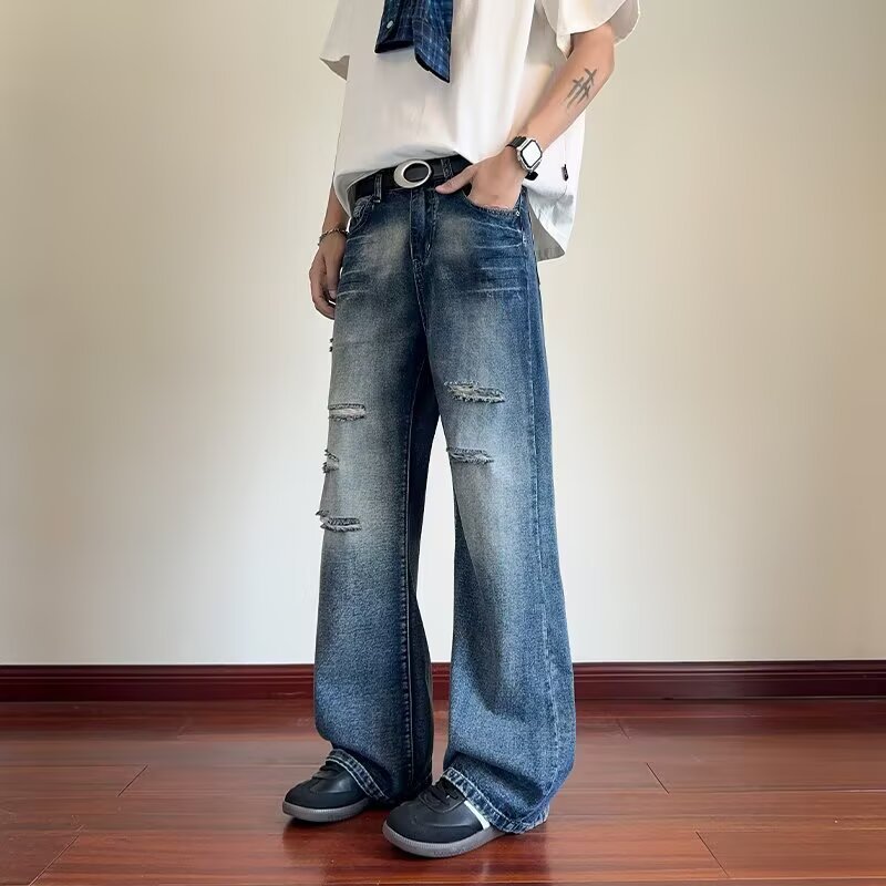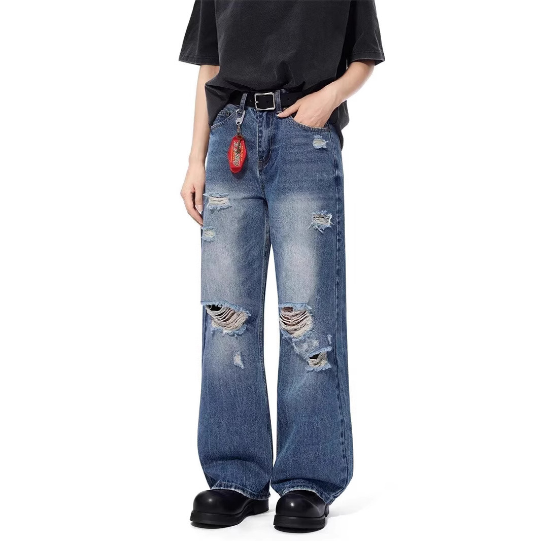 春夏アメリカンレトロウォッシュヘビーリップルーズワイドレッグジーンズメンズダメージ加工ハイストリートワークウェアストレートパンツ