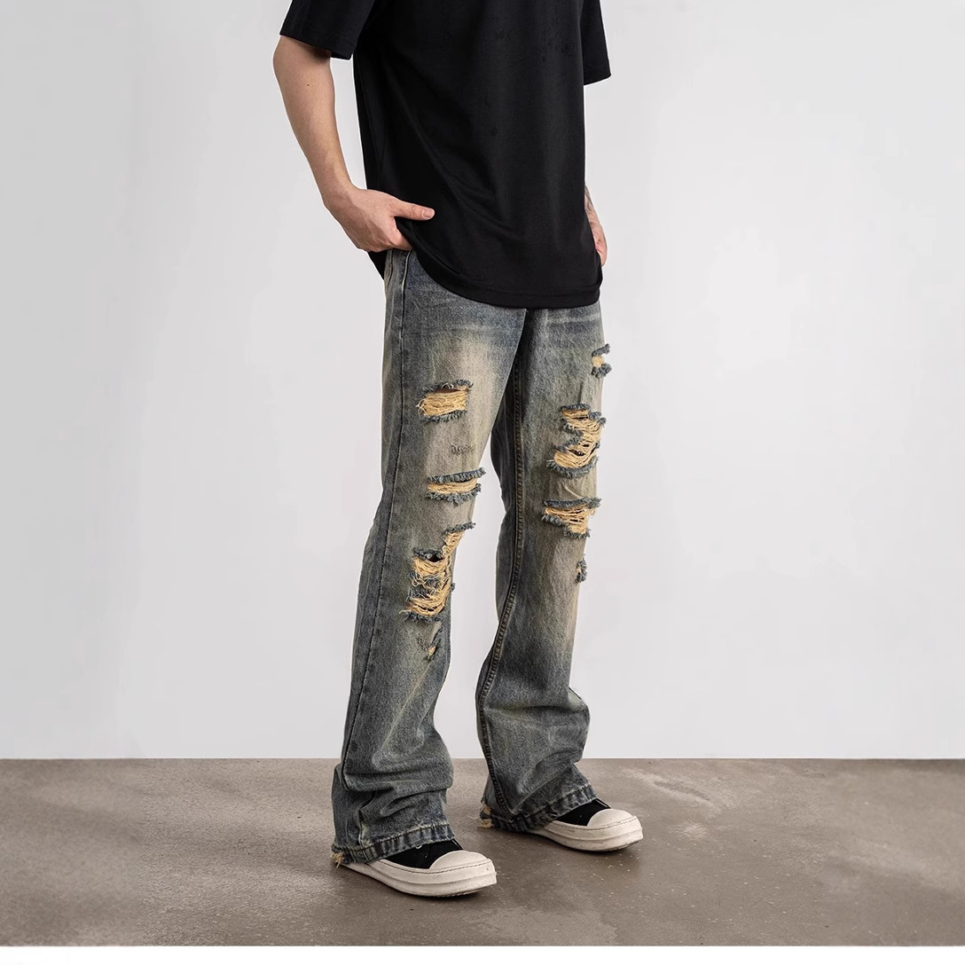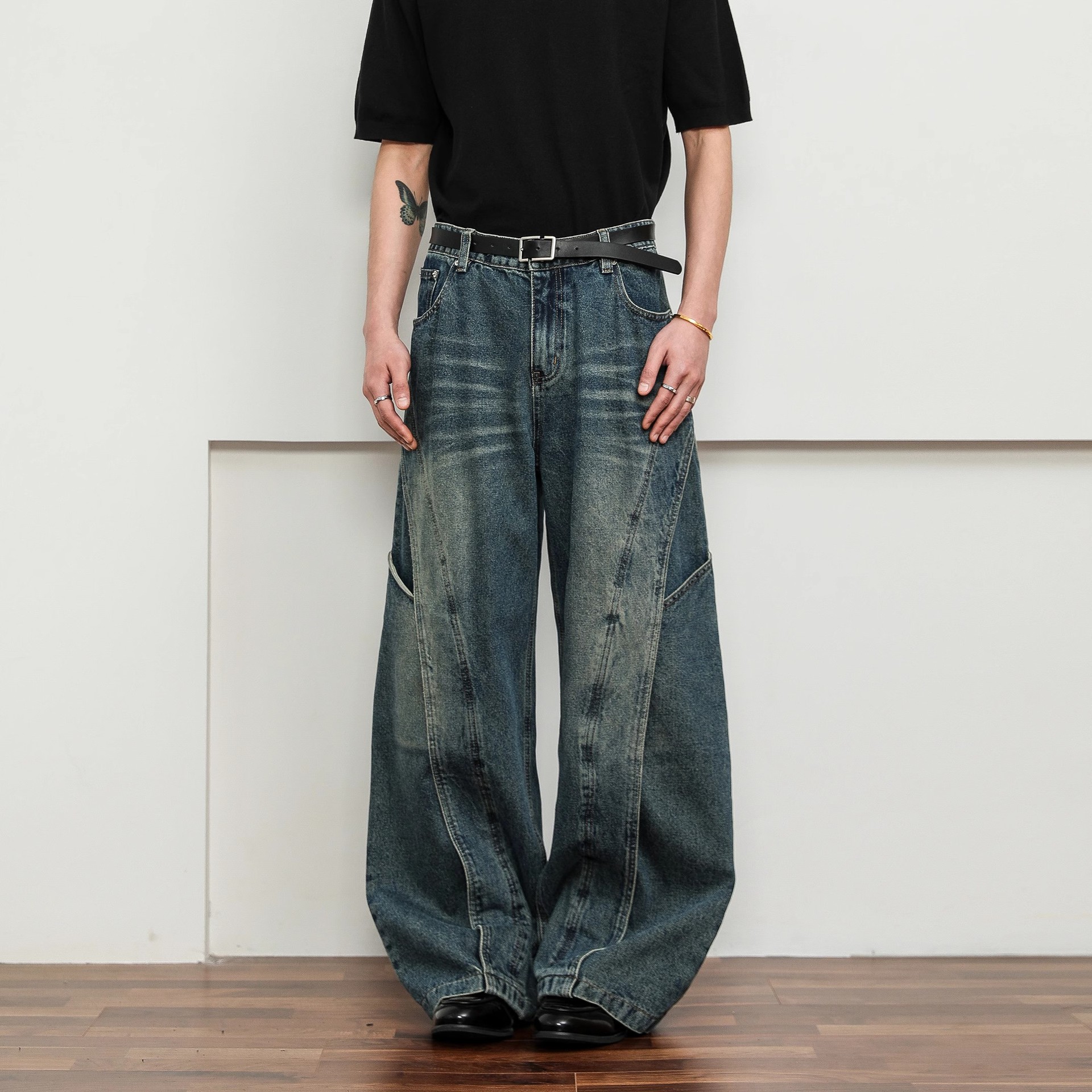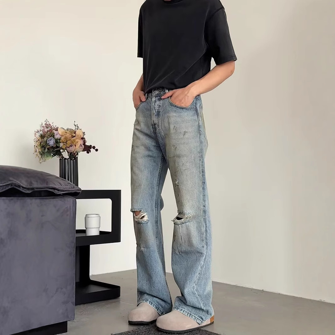 春夏アメリカンレトロウォッシュヘビーリップルーズワイドレッグジーンズメンズダメージ加工ハイストリートワークウェアストレートパンツ