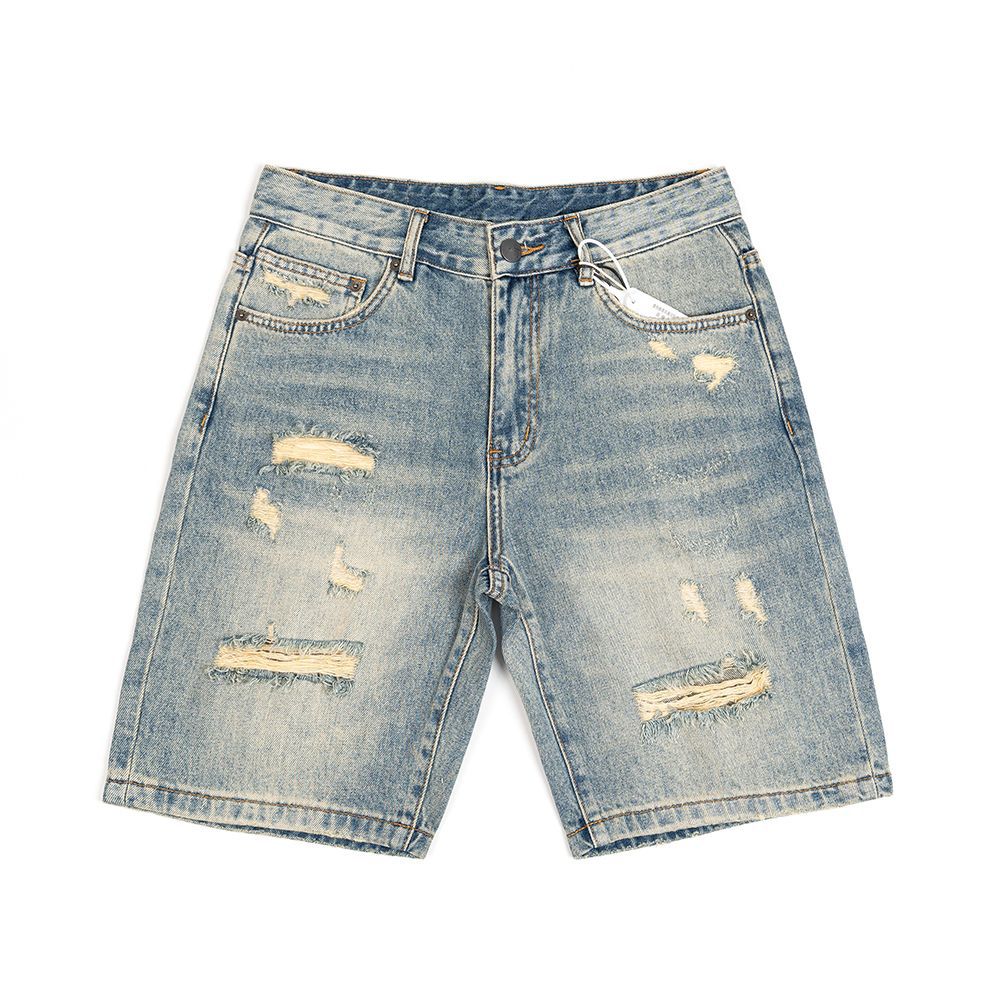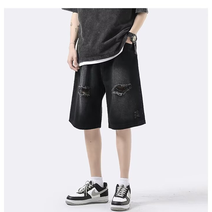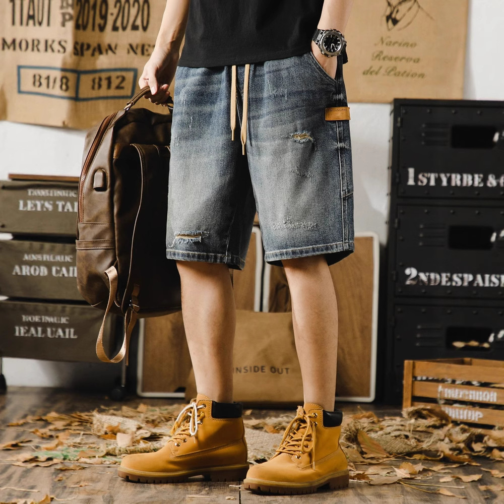 夏用薄型リップドデニムショートパンツメンズアメリカンオールマッチレトロルーズミッドパンツトレンディストリートオールマッチ5点パンツ