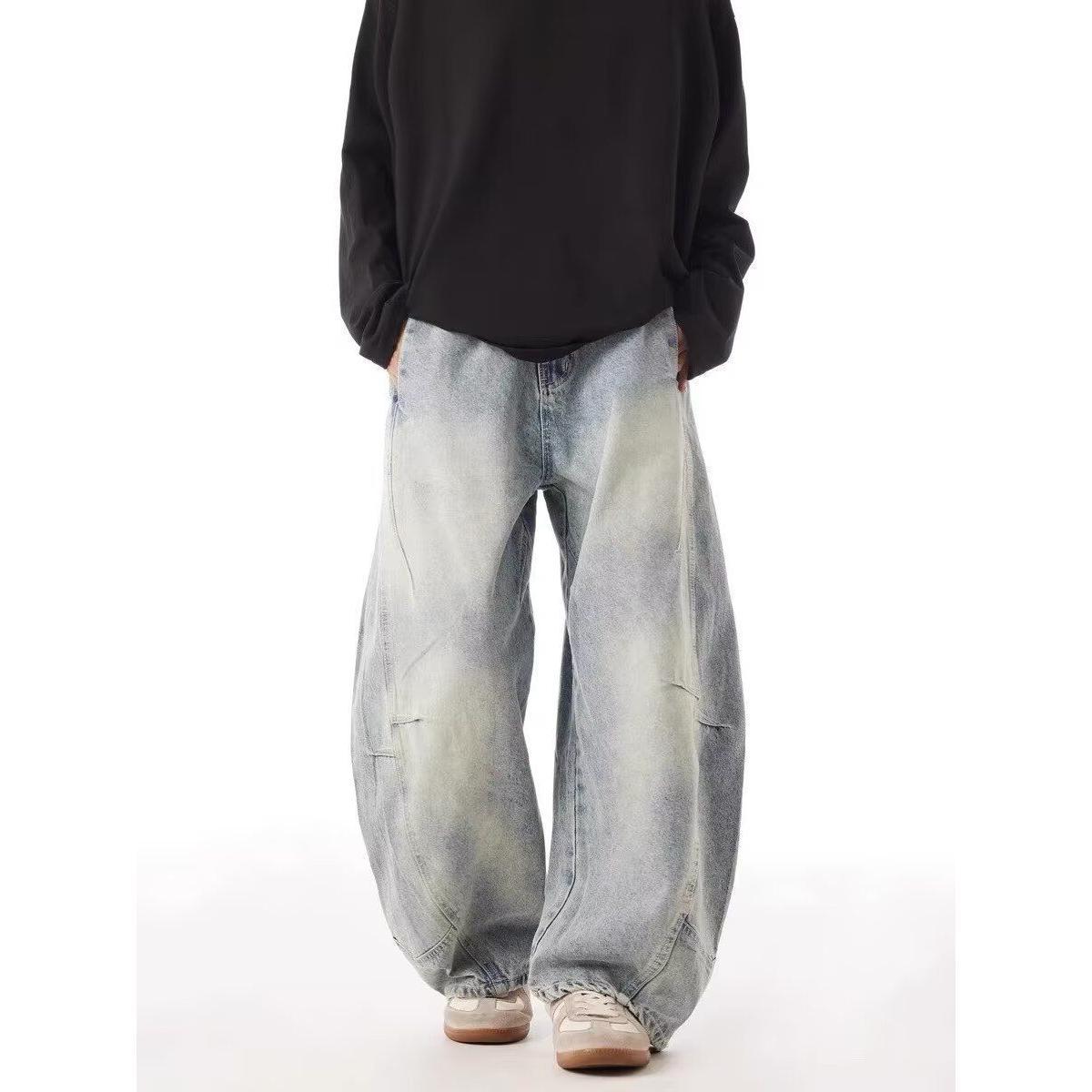 アメリカンレトロなウォッシュ加工のディストレストデザインの男女兼用シミタージーンズ、ゆったりとしたワイドレッグシルエットのバナナフロアモップパンツ、トレンディです。