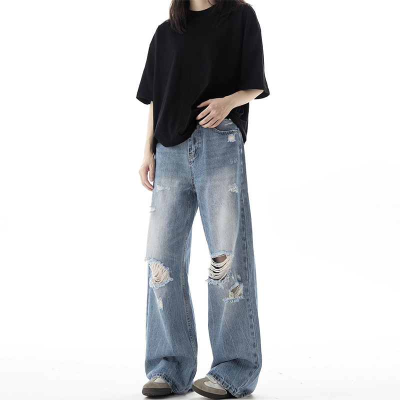アメリカンストリートウォッシュ加工ダメージジーンズメンズ春秋ストレートルーズヨーロッパとアメリカのハイストリートバイブスタイルロングパンツ