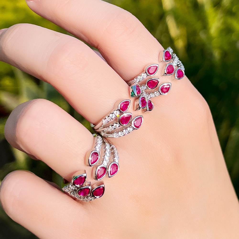 日韓の甘い水滴のルビーの指輪は小さくジルコンの大衆の設計の高級感の3列の手飾りの指輪の卸売りを入れます。