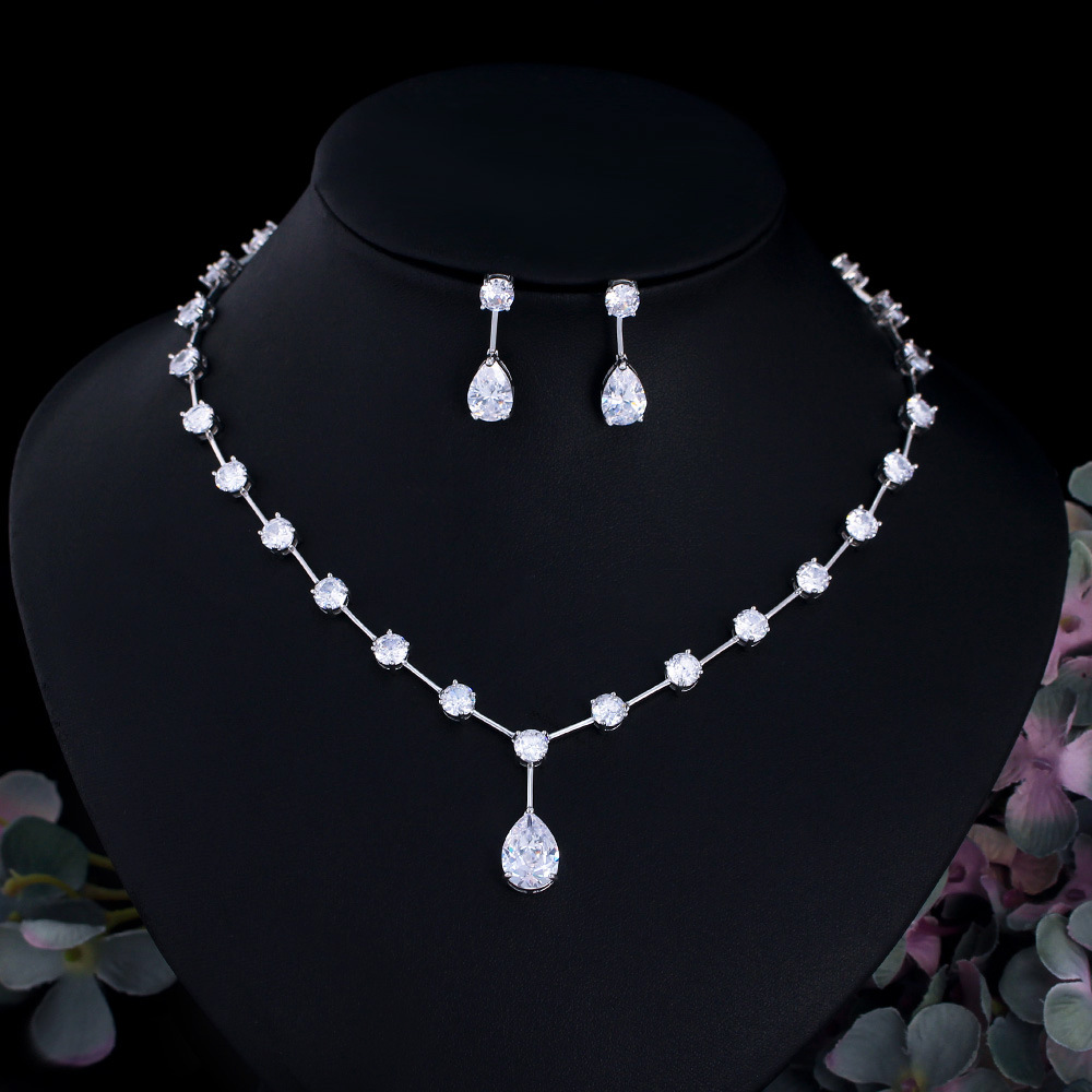 韓国のシンプルなネックレスのイヤリングの小さい大衆の設計の水滴のセットのチェーンの新婦の結婚する晩餐会のドレスはジルコンのセットを飾ります。