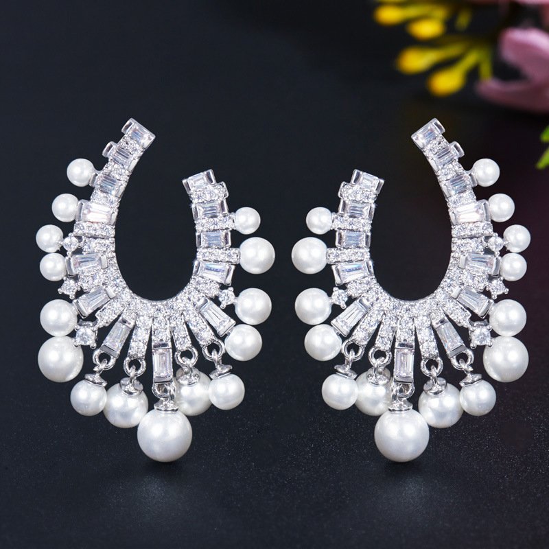 韓国ネット紅軽豪華風s925銀針真珠微嵌め込みジルコン扇形ピアス街拍生中継イヤリングメーカー