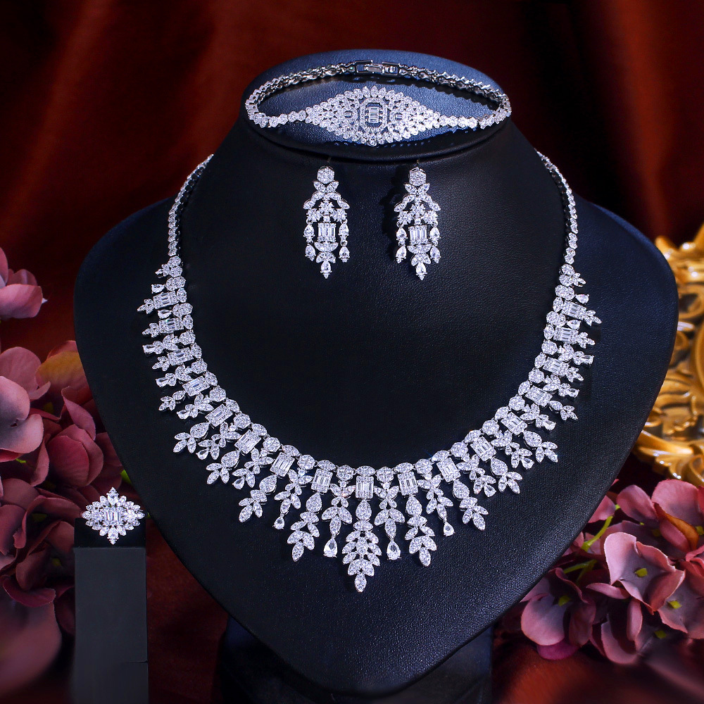 欧米の豪華な晩餐会のドレスは4つのチェーンのネックレスの耳飾りの指輪のブレスレットのきらきらと輝く気前がいいジルコンのセットです。