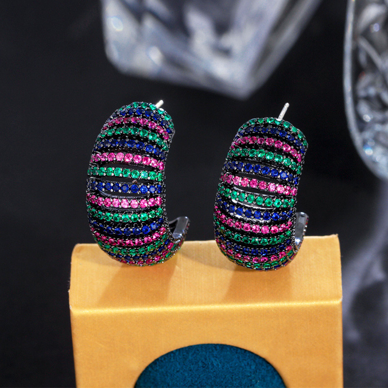 レトロ軽豪華毛虫透かし彫りカラーグラデーションジルコンリング耳飾りs925銀針c形百合イヤリング