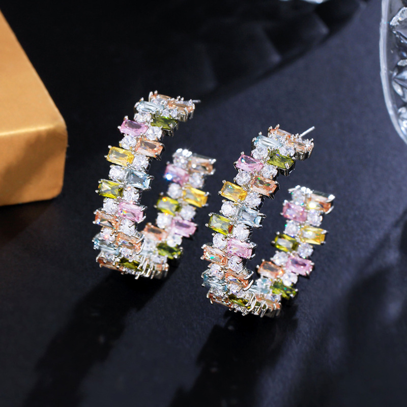 S925銀針重工カラーcリングイヤリング気質キャンディー角型ジルコン不規則カラードリル顔小耳飾り