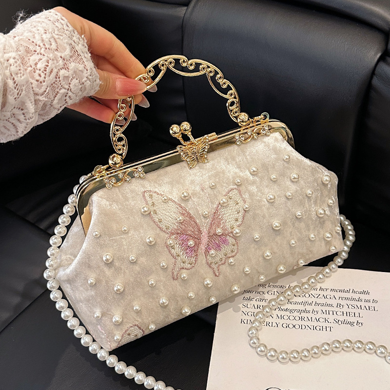 レトロ新中国式軽豪華真珠蝶晩餐包女子国風高級感金糸パイル質感斜め掛け旗ガウンバッグ