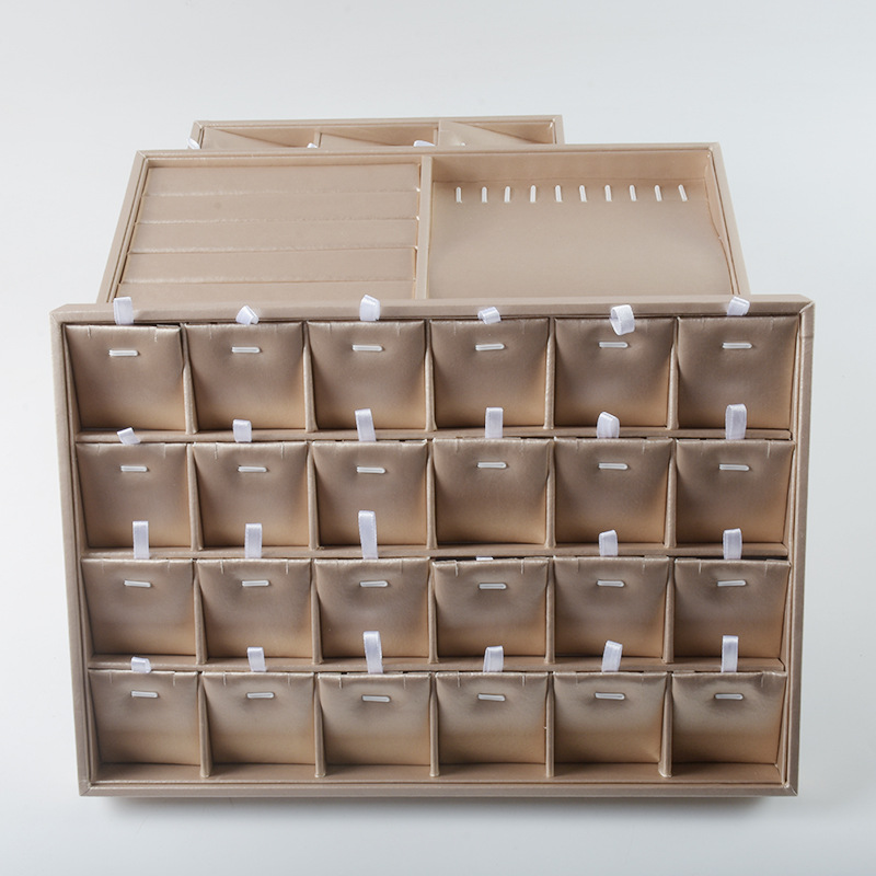 シャンパンゴールドカラーシルクpuレザージュエリー展示カウンター収納トレーリングリングペンダントネックレスピアスリング皿