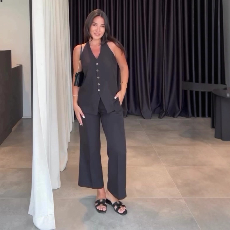 2025 夏ヨーロッパとアメリカの貿易婦人服クロスボーダーカジュアル通勤気質ノースリーブボタントップとパンツ 2 点セット