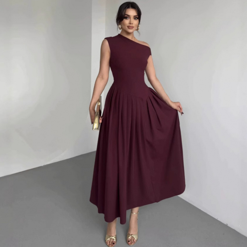 2025 夏の新しいヨーロッパとアメリカのアマゾンクロスボーダー婦人服無地斜め襟ラグランスリーブロング気質ドレス