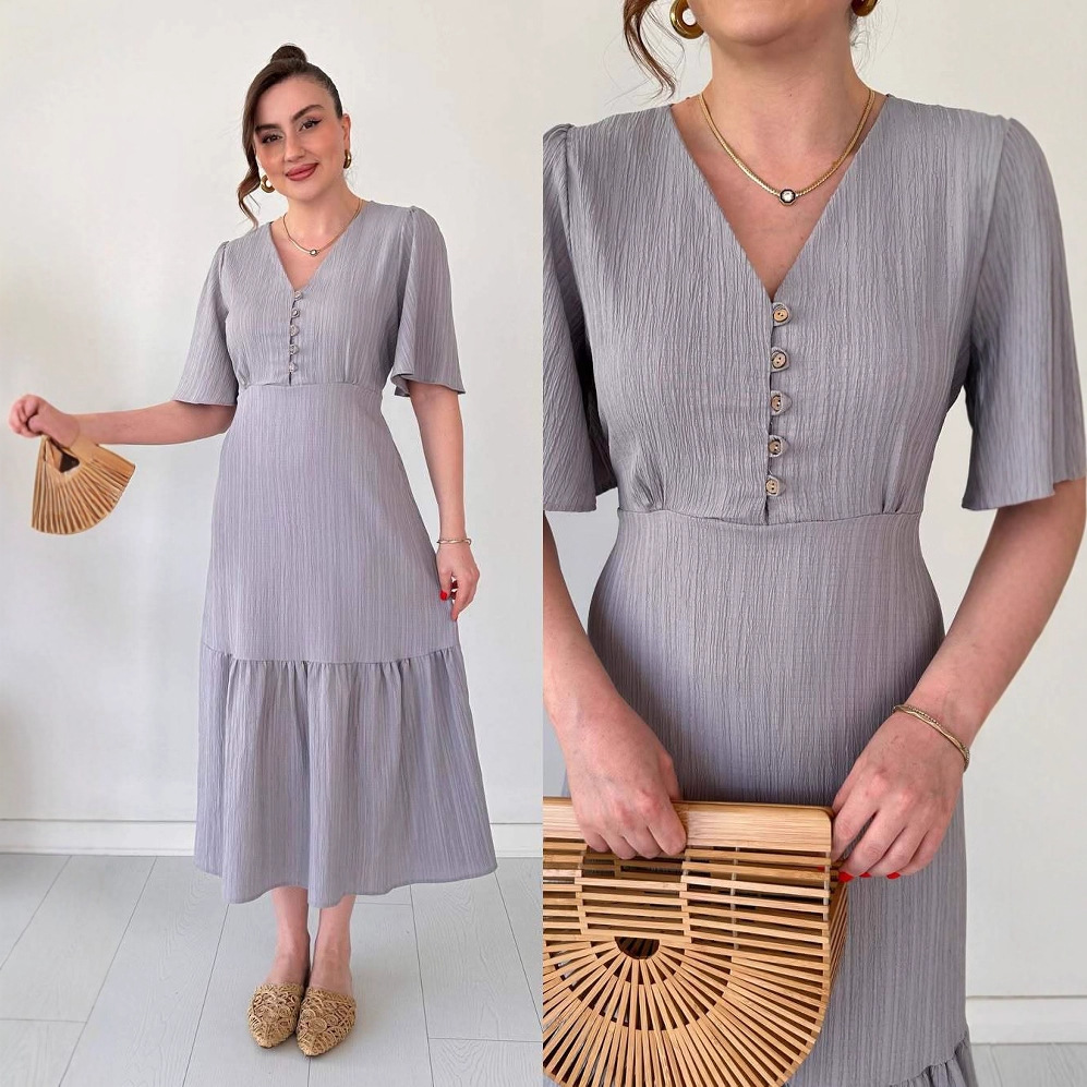 ヨーロッパとアメリカのクロスボーダーロングスカート2025夏の新しいファッションカジュアルエレガントな気質ウエスト痩身半袖ボタンドレス