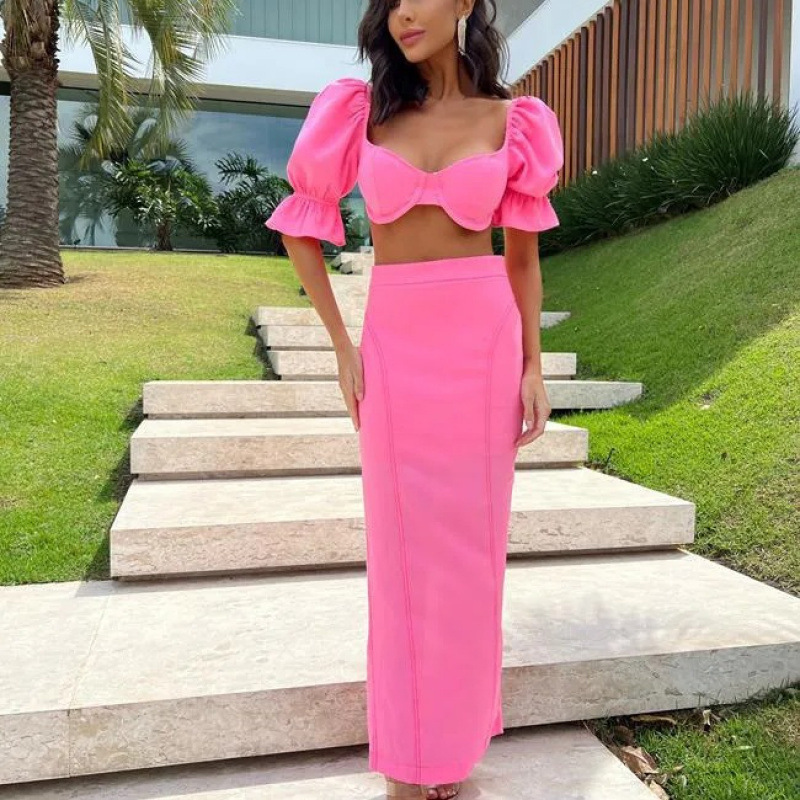ヨーロッパとアメリカのアマゾンクロスボーダー対外貿易婦人服新しいセクシーなバックレスパフスリーブチューブトップスリットウエストロングスカートセット