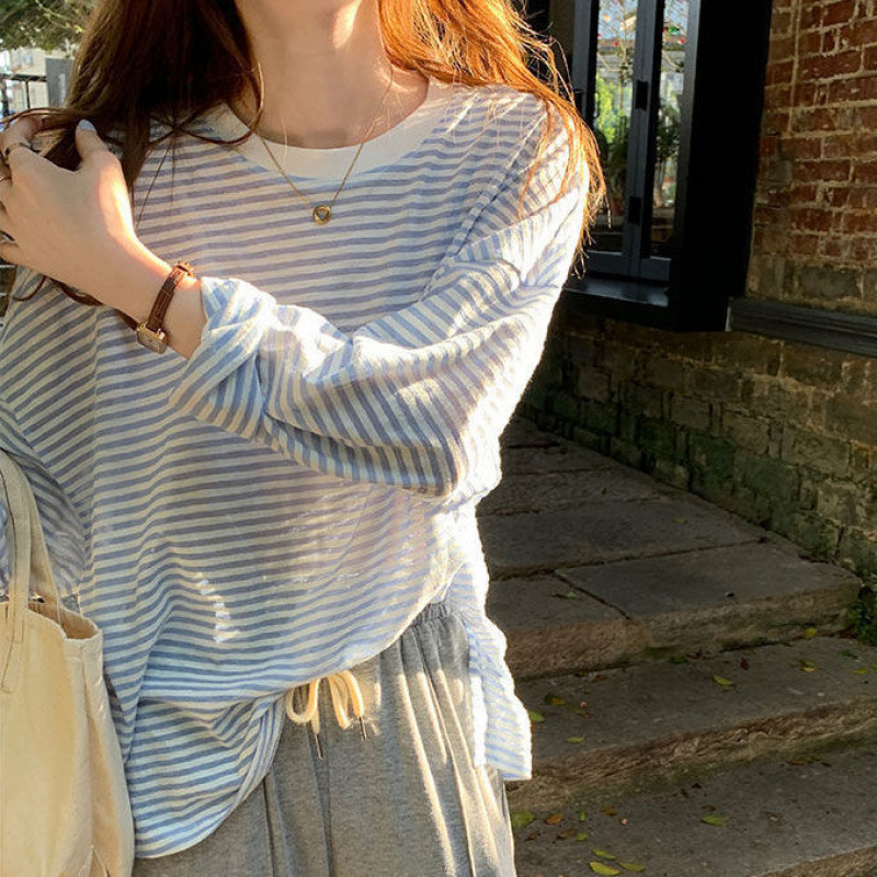 大きいサイズのストライプの長袖のtシャツの女性の夏の薄いタイプの氷の糸のゆったりしたデザイン感の小さい大衆の独特な日焼け止めのブラウスの上着の潮