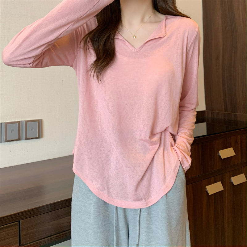 韓国版ピンクvネック長袖tシャツ女性2025新型夏の薄い氷糸日焼け止めシャツエアコンブラウスに服を着せる