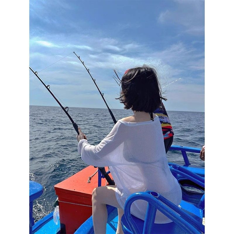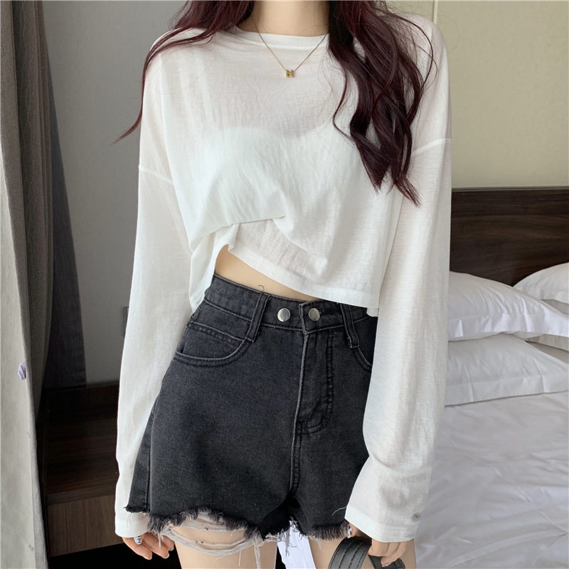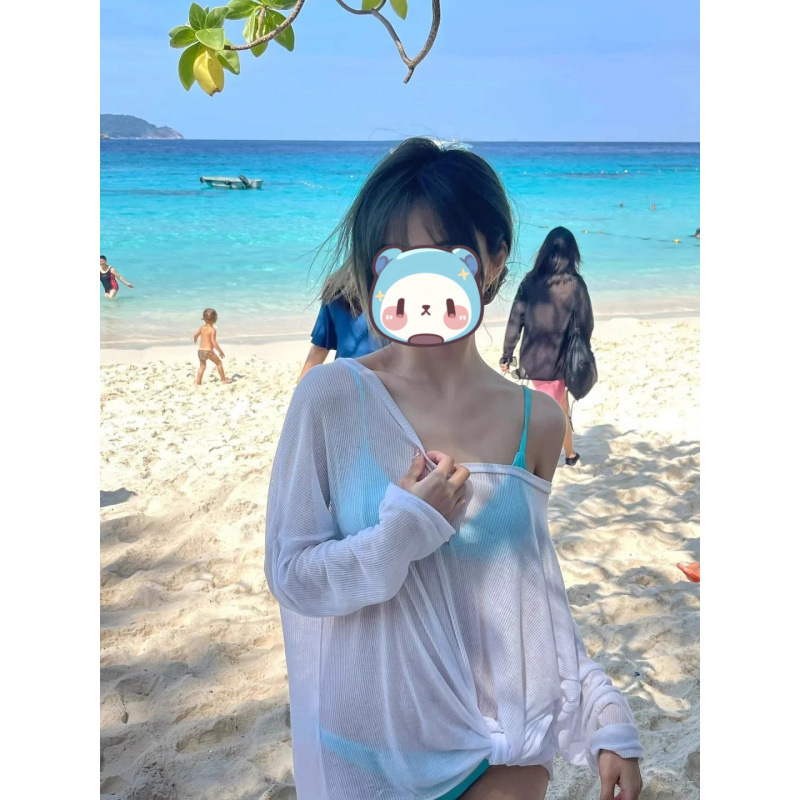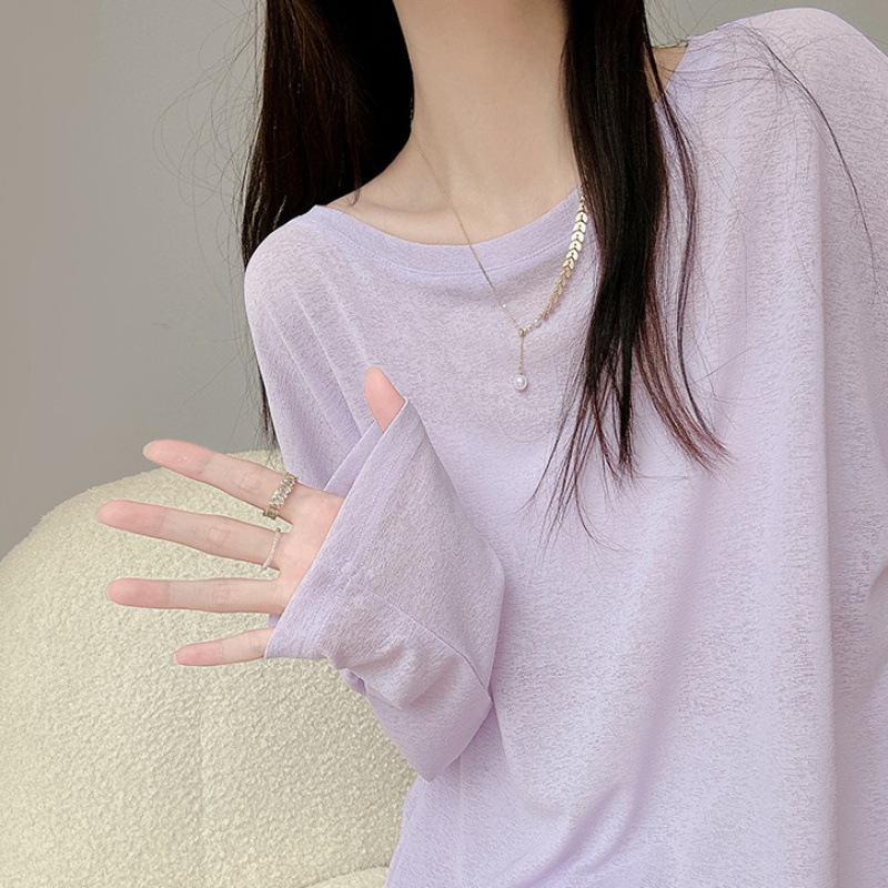 ホワイトニット Tシャツ長袖日焼け止めブラウス女性の夏のアイスシルクルーズボトムシャツ薄いシースルーアウタートップ