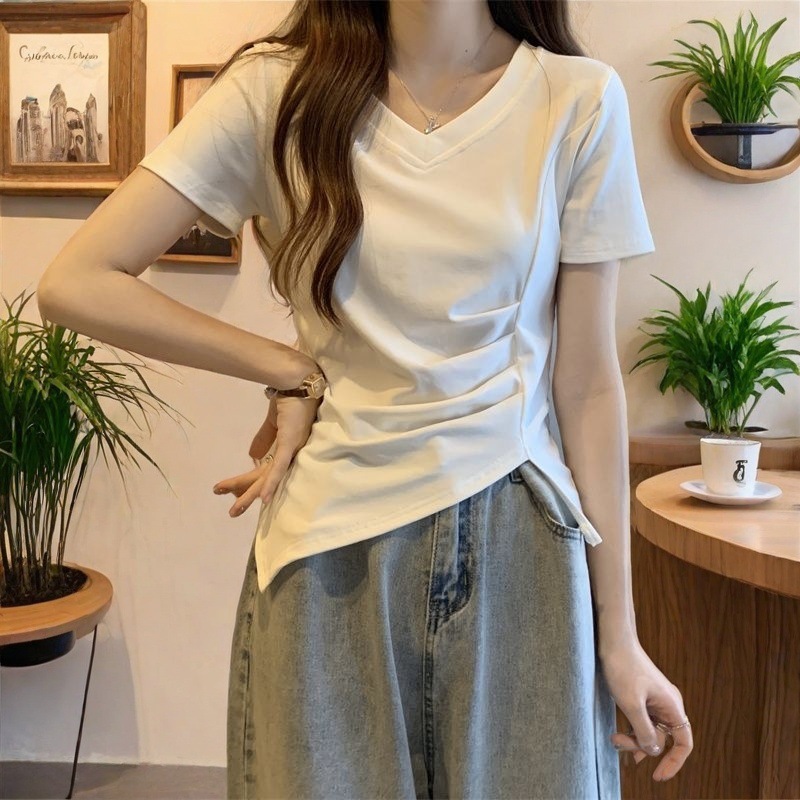 純綿の不規則なvネックの上着の女性の夏の雰囲気はやせています。