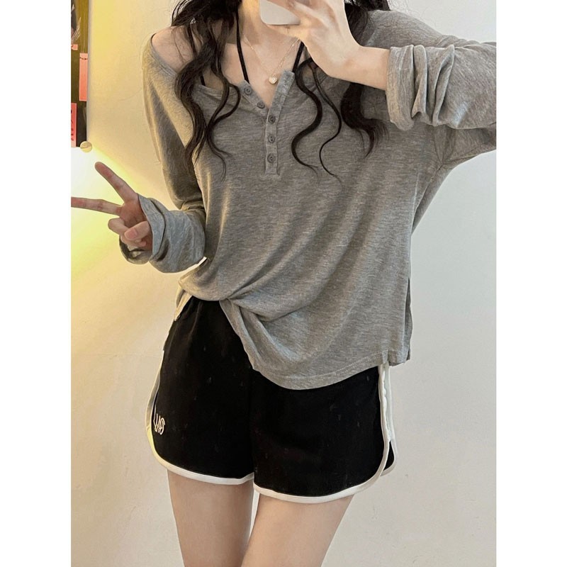 グレーのレイジースタイル長袖薄手ブラウス日焼け止めTシャツレディース春夏ハーフオープンカラーリラックスルーズスリミングトップ