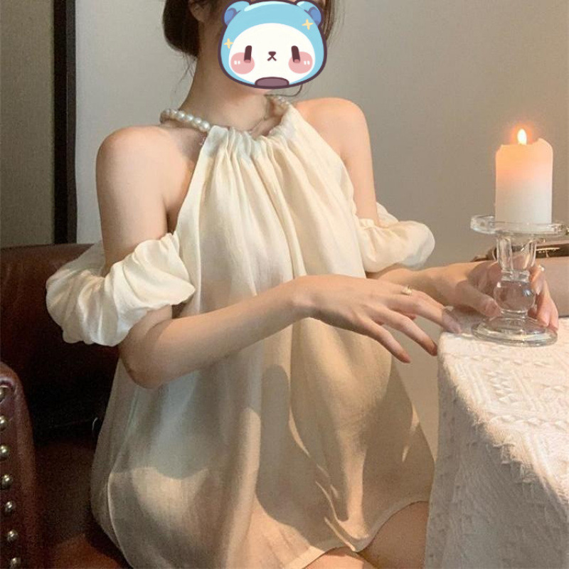 真珠の首の泡の袖の肩のシャツの女性の夏の優しい風の半袖のシフォンのシャツは肩幅の松のカジュアルな上着を掘ります。