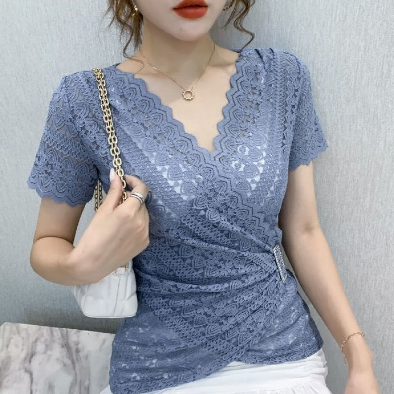 レースシャツ女性半袖2025夏の新型韓国版百合は痩せているtシャツvネックジャケット女性半袖上着