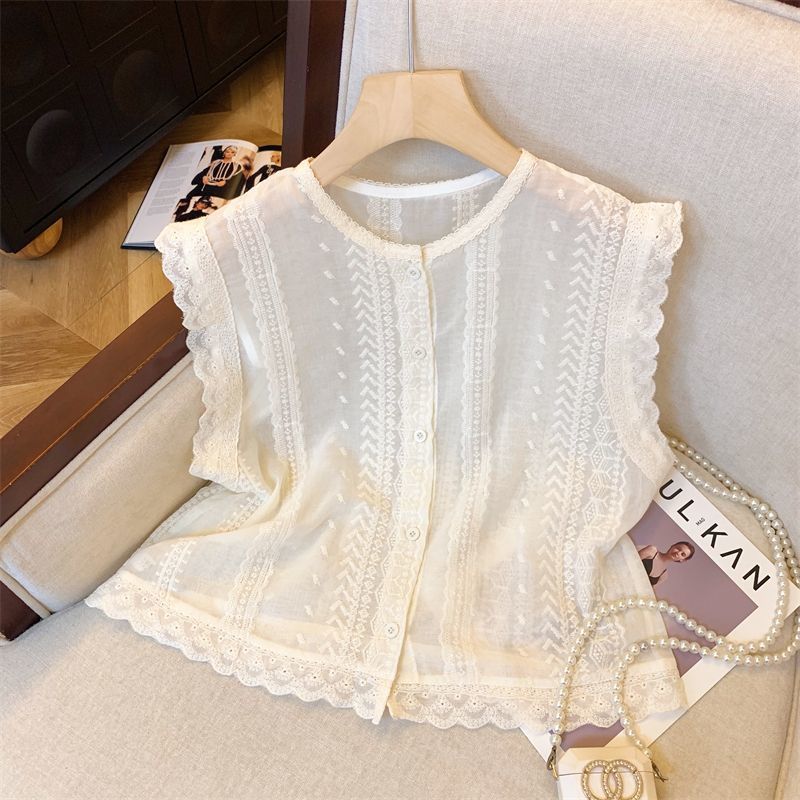 フランスの甘い杏色のレースの刺繍の小さい飛袖のシャツの女性の夏の今年の流行の気質の袖なしの上着